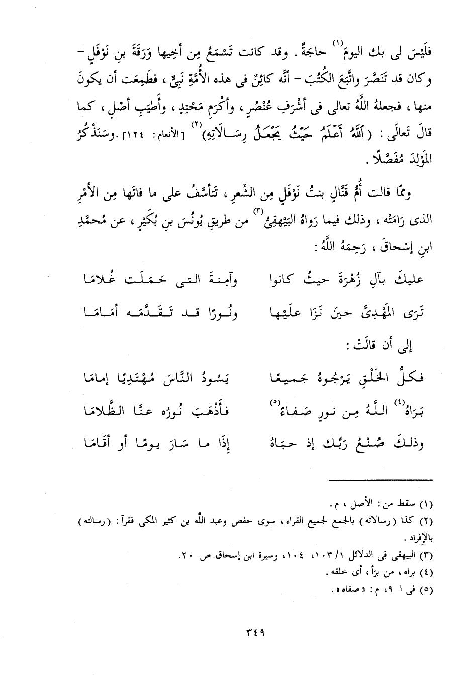 فَلَيْسَ لِي بِكَ الْيَوْمَ حَاجَةٌ. وَقَدْ كَانَتْ تَسْمَعُ مِنْ أَخِيهَا وَرَقَةَ بْنِ نَوْفَلٍ - وَكَانَ قَدْ تَنَصَّرَ، وَاتَّبَعَ الْكُتُبَ - أَنَّهُ كَائِنٌ فِي هَذِهِ الْأُمَّةِ نَبِيٌّ فَطَمِعَتْ أَنْ يَكُونَ مِنْهَا فَجَعَلَهُ اللَّهُ تَعَالَى فِي أَشْرَفِ عُنْصُرٍ وَأَكْرَمِ مَحْتَدٍ، وَأَطْيَبِ أَصْلٍ، كَمَا قَالَ تَعَالَى {اللَّهُ أَعْلَمُ حَيْثُ يَجْعَلُ رِسَالَتَهُ} [الأنعام: 124] وَسَنَذْكُرُ الْمَوْلِدَ مُفَصَّلًا.