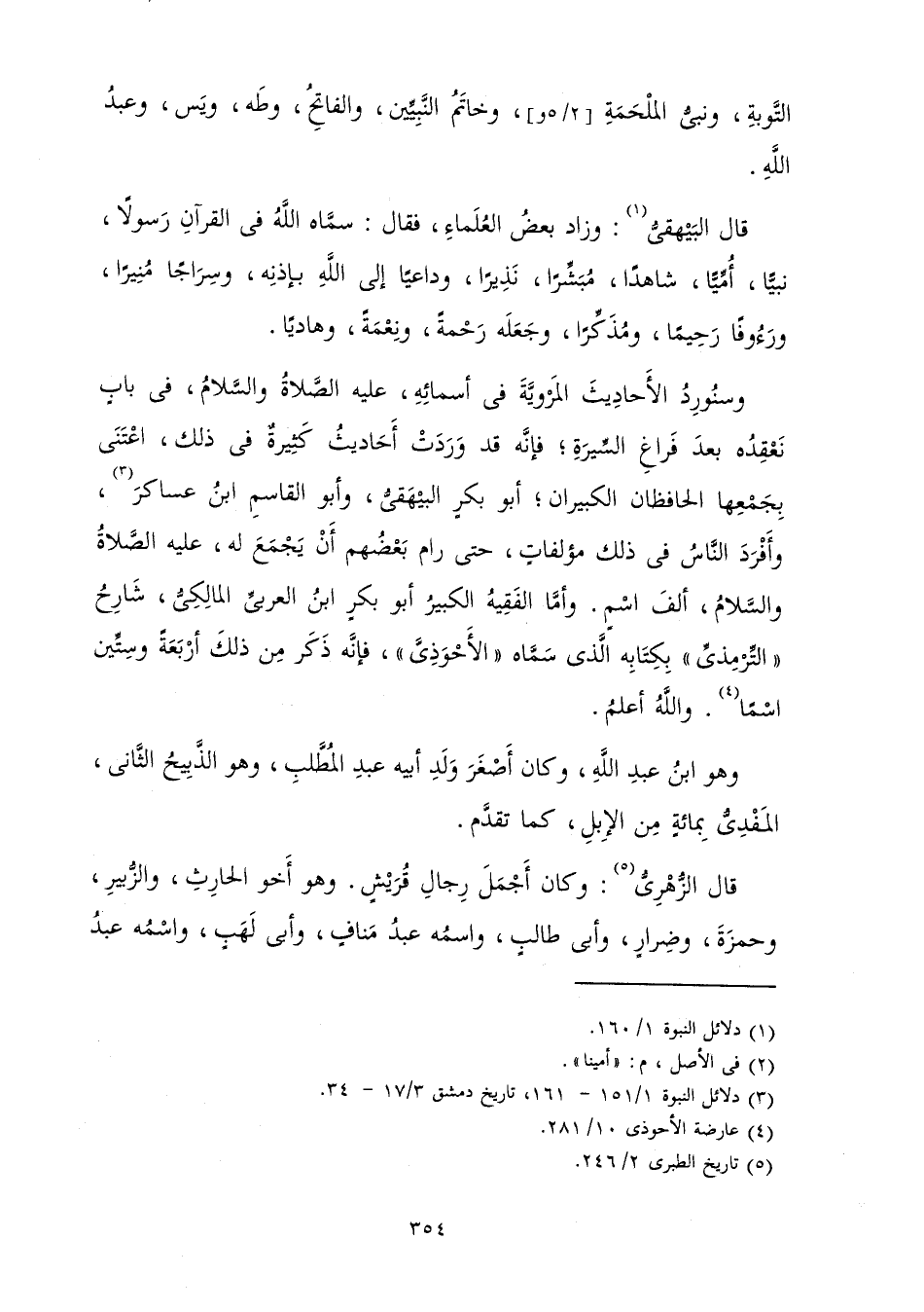 وَسَنُورِدُ الْأَحَادِيثَ الْمَرْوِيَّةَ فِي أَسْمَائِهِ عَلَيْهِ الصَّلَاةُ وَالسَّلَامُ فِي بَابٍ نَعْقِدُهُ بَعْدَ فَرَاغِ السِّيرَةِ فَإِنَّهُ قَدْ وَرَدَتْ أَحَادِيثُ كَثِيرَةٌ فِي ذَلِكَ، اعْتَنَى بِجَمْعِهَا الْحَافِظَانِ الْكَبِيرَانِ أَبُو بَكْرٍ الْبَيْهَقِيُّ، وَأَبُو الْقَاسِمِ ابْنُ عَسَاكِرَ، وَأَفْرَدَ النَّاسُ فِي ذَلِكَ مُؤَلَّفَاتٍ حَتَّى رَامَ بَعْضُهُمْ أَنْ يَجْمَعَ لَهُ عَلَيْهِ الصَّلَاةُ وَالسَّلَامُ أَلْفَ اسْمٍ. وَأَمَّا الْفَقِيهُ الْكَبِيرُ أَبُو بَكْرِ ابْنُ الْعَرَبِيِّ الْمَالِكِيُّ شَارِحُ التِّرْمِذِيِّ بِكِتَابِهِ الَّذِي سَمَّاهُ الْأَحْوَذِيَّ فَإِنَّهُ ذَكَرَ مِنْ ذَلِكَ أَرْبَعَةً وَسِتِّينَ اسْمًا. وَاللَّهُ أَعْلَمُ.