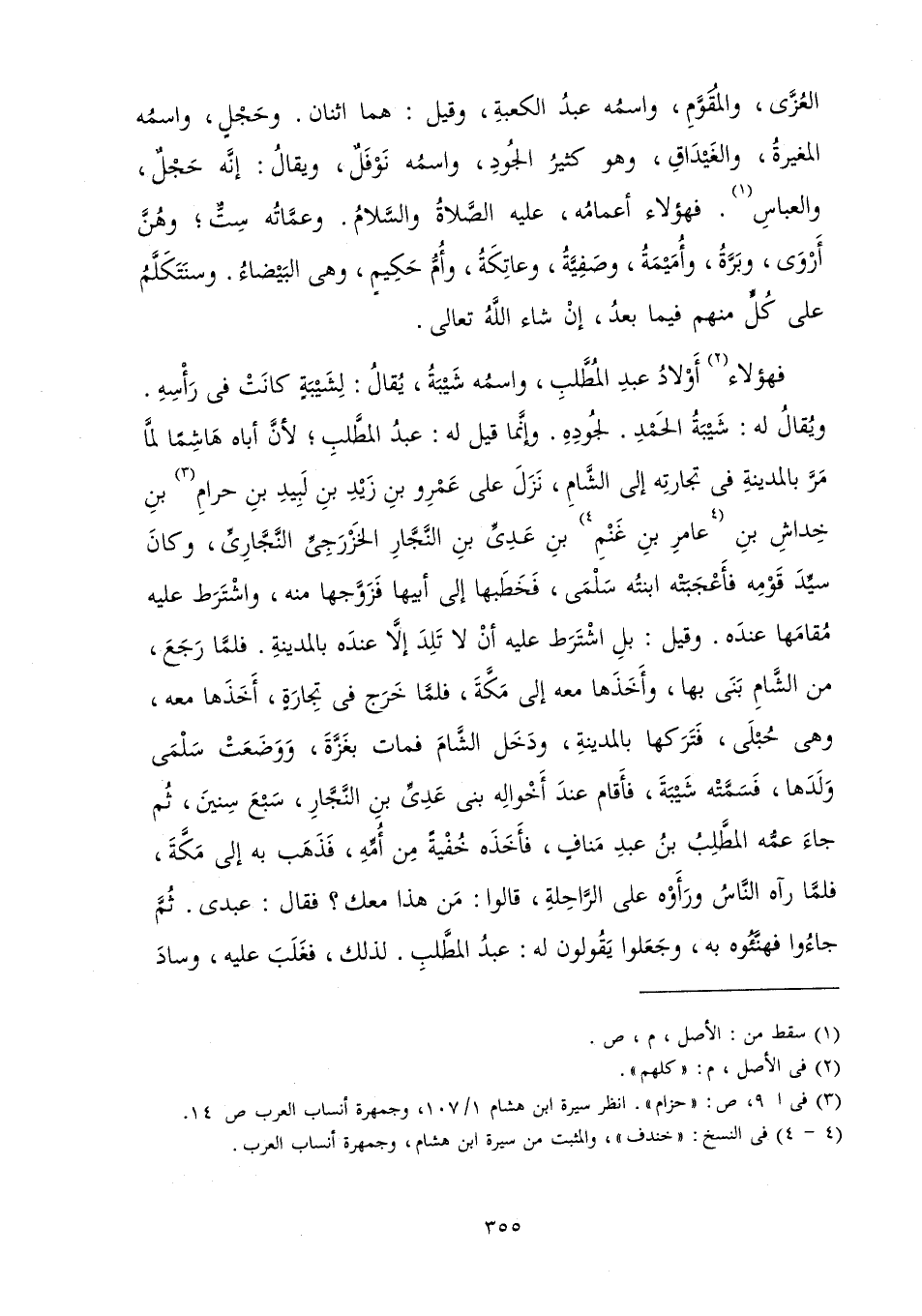 فَهَؤُلَاءِ أَوْلَادُ عَبْدِ الْمُطَّلِبِ، وَاسْمُهُ شَيْبَةُ يُقَالَ: لِشَيْبَةٍ كَانَتْ فِي رَأْسِهِ، وَيُقَالَ لَهُ: شَيْبَةُ الْحَمْدِ لِجُودِهِ، وَإِنَّمَا قِيلَ لَهُ: عَبْدُ الْمُطَّلِبِ; لِأَنَّ أَبَاهُ هَاشِمًا لَمَّا مَرَّ بِالْمَدِينَةِ فِي تِجَارَتِهِ إِلَى الشَّامِ نَزَلَ عَلَى عَمْرِو بْنِ زَيْدِ بْنِ لَبِيدِ بْنِ حَرَامِ بْنِ خِدَاشِ بْنِ عَامِرِ بْنِ غَنْمِ بْنِ عَدِيِّ بْنِ النَّجَّارِ الْخَزْرَجِيِّ النَّجَّارِيِّ وَكَانَ سَيِّدَ قَوْمِهِ فَأَعْجَبَتْهُ ابْنَتُهُ سَلْمَى فَخَطَبَهَا إِلَى أَبِيهَا فَزَوَّجَهَا مِنْهُ، وَاشْتَرَطَ عَلَيْهِ مُقَامَهَا عِنْدَهُ.