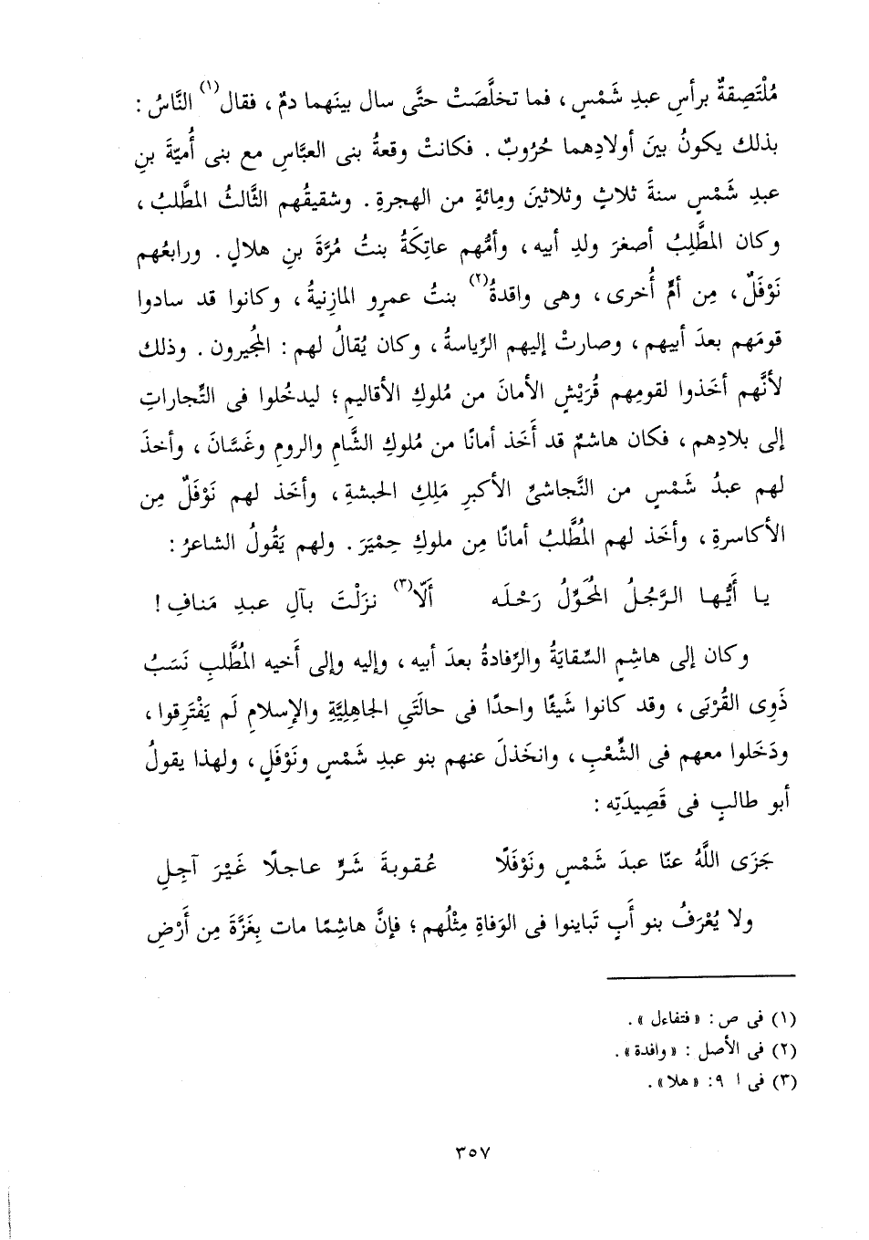 يَا أَيُّهَا الرَّجُلُ الْمُحَوِّلُ رَحْلَهُ ألَّا نَزَلْتَ بَآلِ عِبْدِ مَنَافِ وَكَانَ إِلَى هَاشِمٍ السِّقَايَةُ وَالرِّفَادَةُ بَعْدَ أَبِيهِ، وَإِلَيْهِ وَإِلَى أَخِيهِ الْمُطَّلِبِ نَسَبُ ذَوِي الْقُرْبَى، وَقَدْ كَانُوا شَيْئًا وَاحِدًا فِي حَالَتِيِ الْجَاهِلِيَّةِ وَالْإِسْلَامِ لَمْ يَفْتَرِقُوا، وَدَخَلُوا مَعَهُمْ فِي الشِّعْبِ، وَانْخَذَلَ عَنْهُمْ بَنُو عَبْدِ شَمْسٍ وَنَوْفَلٍ، وَلِهَذَا يَقُولُ أَبُو طَالِبٍ فِي قَصِيدَتِهِ: