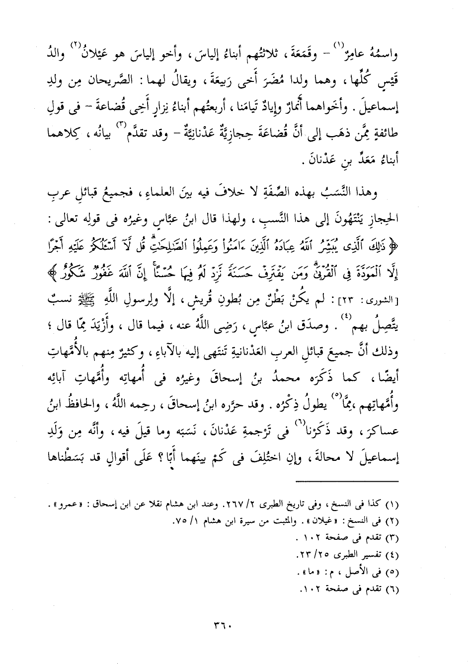 وَهَذَا النَّسَبُ بِهَذِهِ الصِّفَةِ لَا خِلَافَ فِيهِ بَيْنَ الْعُلَمَاءِ فَجَمِيعُ قَبَائِلِ عَرَبِ الْحِجَازِ يَنْتَهُونَ إِلَى هَذَا النَّسَبِ، وَلِهَذَا قَالَ ابْنُ عَبَّاسٍ وَغَيْرُهُ فِي قَوْلِهِ تَعَالَى: {ذَلِكَ الَّذِي يُبَشِّرُ اللَّهُ عِبَادَهُ الَّذِينَ آمَنُوا وَعَمِلُوا الصَّالِحَاتِ قُلْ لَا أَسْأَلُكُمْ عَلَيْهِ أَجْرًا إِلَّا الْمَوَدَّةَ فِي الْقُرْبَى وَمَنْ يَقْتَرِفْ حَسَنَةً نَزِدْ لَهُ فِيهَا حُسْنَى إِنَّ اللَّهَ غَفُورٌ شَكُورٌ} [الشورى: 23] لَمْ يَكُنْ بَطْنٌ مِنْ بُطُونِ قُرَيْشٍ، إِلَّا وَلِرَسُولِ اللَّهِ صَلَّى اللَّهُ عَلَيْهِ وَسَلَّمَ نَسَبٌ يَتَّصِلُ بِهِمْ. وَصَدَقَ ابْنُ عَبَّاسٍ رَضِيَ اللَّهُ عَنْهُ فِيمَا قَالَ، وَأَزْيَدَ مِمَّا قَالَ; وَذَلِكَ أَنَّ جَمِيعَ قَبَائِلِ الْعَرَبِ الْعَدْنَانِيَّةِ تَنْتَهِي إِلَيْهِ بِالْآبَاءِ وَكَثِيرٌ مِنْهُمْ بِالْأُمَّهَاتِ أَيْضًا، كَمَا ذَكَرَ مُحَمَّدُ بْنُ إِسْحَاقَ وَغَيْرُهُ فِي أُمَّهَاتِهِ وَأُمَّهَاتِ آبَائِهِ وَأُمَّهَاتِهِمْ، مِمَّا يَطُولُ ذِكْرُهُ. وَقَدْ حَرَّرَهُ ابْنُ إِسْحَاقَ رَحِمَهُ اللَّهُ وَالْحَافِظُ ابْنُ عَسَاكِرَ، وَقَدْ ذَكَرْنَا فِي تَرْجَمَةِ عَدْنَانَ، نَسَبَهُ وَمَا قِيلَ فِيهِ، وَأَنَّهُ مِنْ وَلَدِ إِسْمَاعِيلَ لَا مَحَالَةَ، وَإِنِ اخْتُلِفَ فِي كَمْ بَيْنَهُمَا أَبًا؟ عَلَى أَقْوَالٍ قَدْ بَسَطْنَاهَا