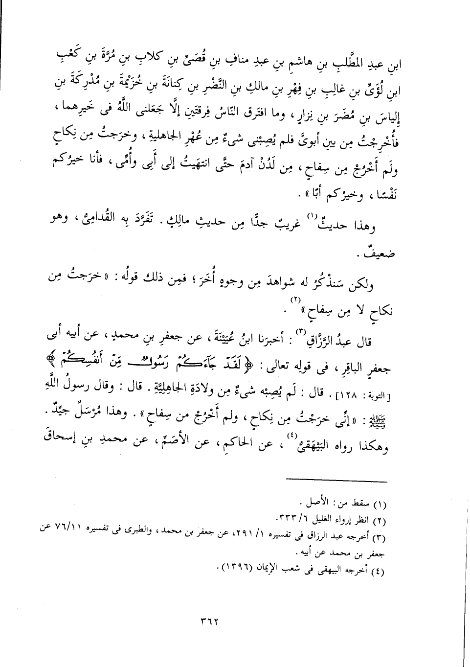 وَهَذَا حَدِيثٌ غَرِيبٌ جِدًّا مِنْ حَدِيثِ مَالِكٍ تَفَرَّدَ بِهِ الْقُدَامِىُّ وَهُوَ ضَعِيفٌ. وَلَكِنْ سَنَذْكُرُ لَهُ شَوَاهِدَ مِنْ وُجُوهٍ أُخَرَ; فَمِنْ ذَلِكَ قَوْلُهُ «خَرَجْتُ مِنْ نِكَاحٍ لَا مِنْ سِفَاحٍ» قَالَ عَبْدُ الرَّزَّاقِ: أَخْبَرَنَا ابْنُ عُيَيْنَةَ عَنْ جَعْفَرِ بْنِ مُحَمَّدٍ عَنْ أَبِيهِ أَبِي جَعْفَرٍ الْبَاقِرِ فِي قَوْلِهِ تَعَالَى {لَقَدْ جَاءَكُمْ رَسُولٌ مِنْ أَنْفُسِكُمْ} [التوبة: 128] قَالَ: لَمْ يُصِبْهُ شَيْءٌ مِنْ وِلَادَةِ الْجَاهِلِيَّةِ. قَالَ: «وَقَالَ رَسُولُ اللَّهِ صَلَّى اللَّهُ عَلَيْهِ وَسَلَّمَ: إِنِّي خَرَجْتُ مِنْ نِكَاحٍ، وَلَمْ أَخْرُجْ مِنْ سِفَاحٍ» «. وَهَذَا مُرْسَلٌ جَيِّدٌ. وَهَكَذَا رَوَاهُ» الْبَيْهَقِيُّ عَنِ الْحَاكِمِ عَنِ الْأَصَمِّ عَنْ مُحَمَّدِ بْنِ إِسْحَاقَ