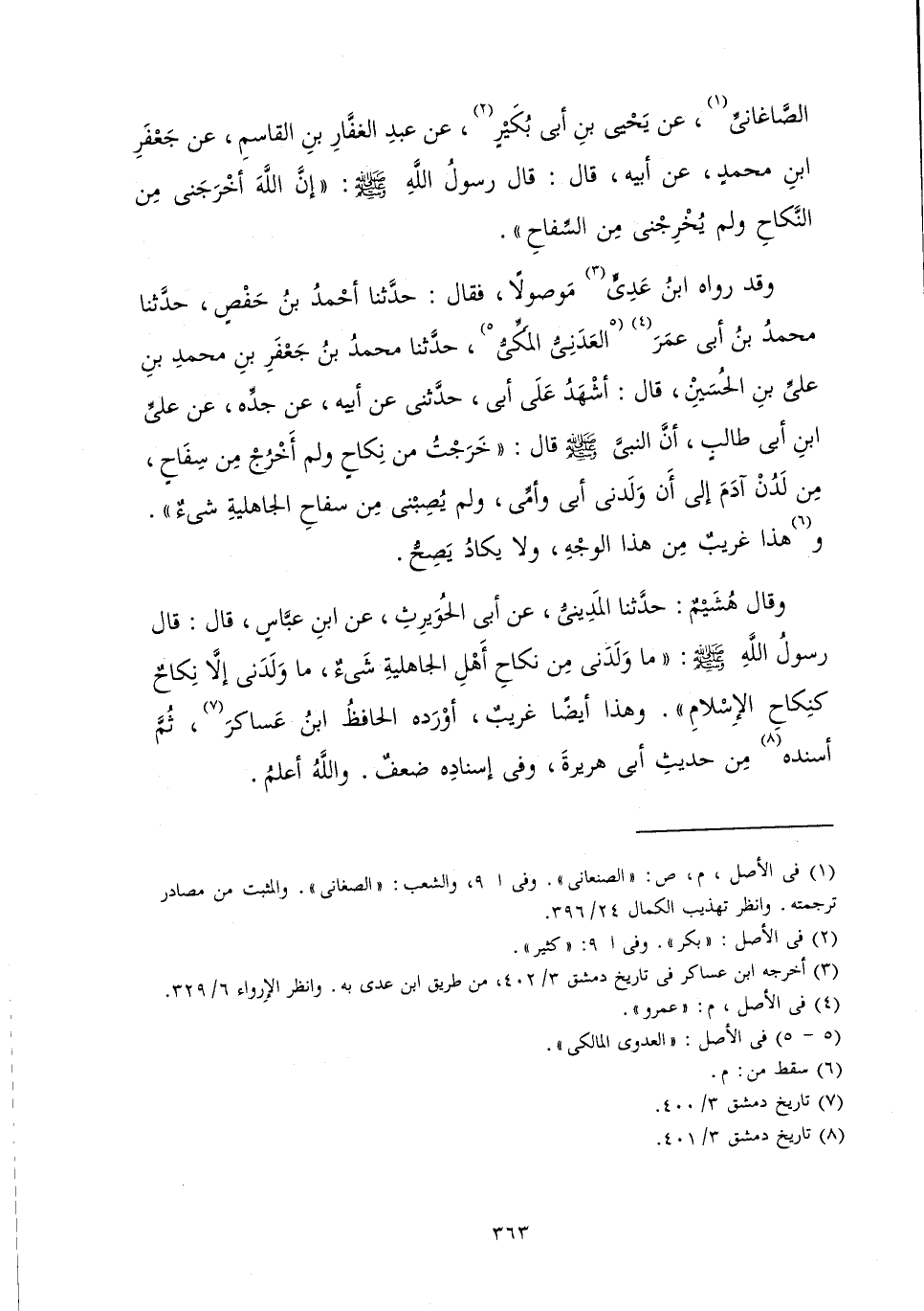 الصَّاغَانِيِّ عَنْ يَحْيَى بْنِ أَبِي بُكَيْرٍ عَنْ عَبْدِ الْغَفَّارِ بْنِ الْقَاسِمِ عَنْ جَعْفَرِ بْنِ مُحَمَّدٍ عَنْ أَبِيهِ قَالَ: قَالَ رَسُولُ اللَّهِ صَلَّى اللَّهُ عَلَيْهِ وَسَلَّمَ: «إِنَّ اللَّهَ أَخْرَجَنِي مِنَ النِّكَاحِ، وَلَمْ يُخْرِجْنِي مِنَ السِّفَاحِ» .