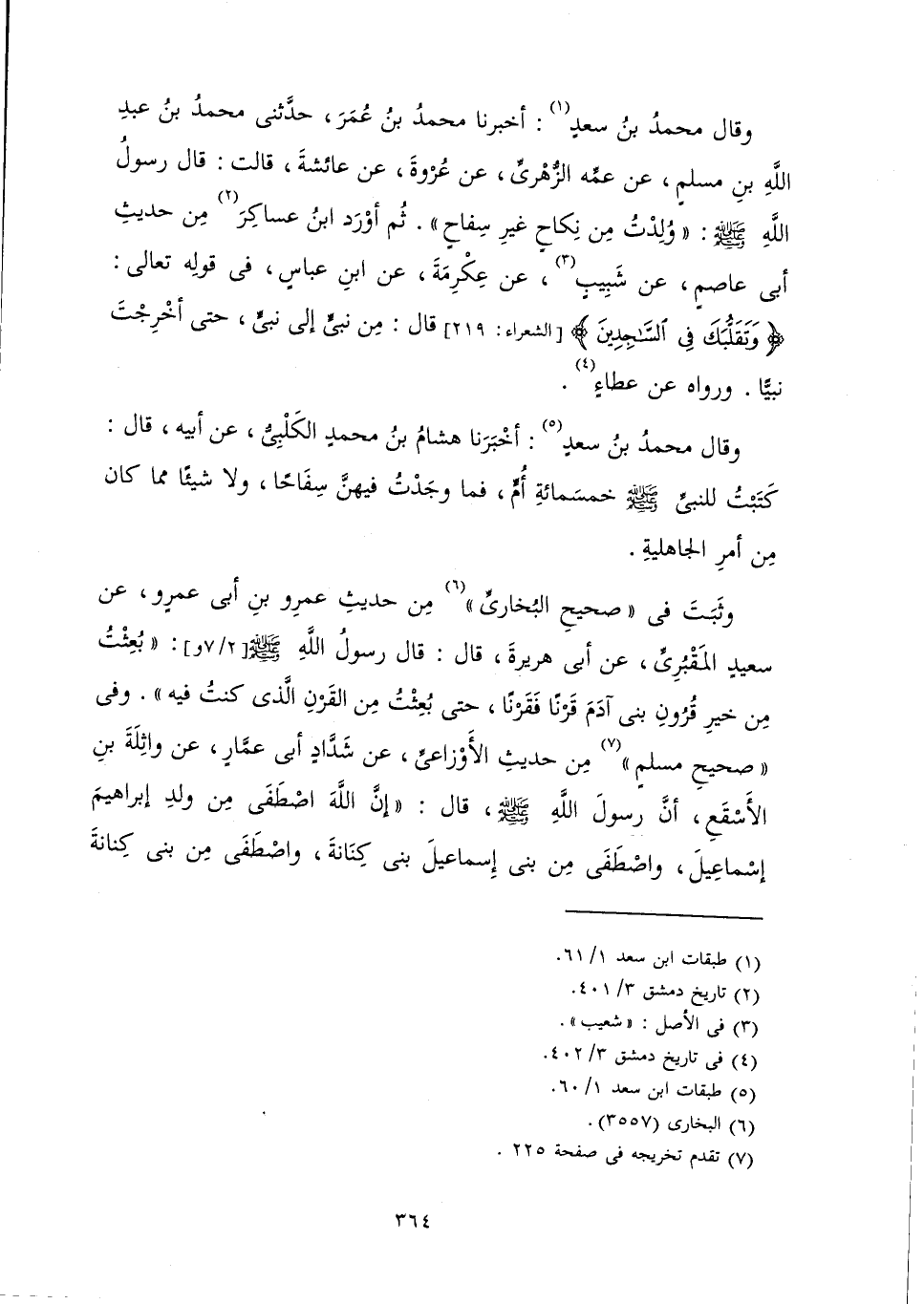 وَثَبَتَ فِي صَحِيحِ الْبُخَارِيِّ مِنْ حَدِيثِ عَمْرِو بْنِ أَبِي عَمْرٍو عَنْ سَعِيدٍ الْمَقْبُرِيِّ عَنْ أَبِي هُرَيْرَةَ قَالَ: قَالَ رَسُولُ اللَّهِ صَلَّى اللَّهُ عَلَيْهِ وَسَلَّمَ: «بُعِثْتُ مِنْ خَيْرِ قُرُونِ بَنِي آدَمَ قَرْنًا فَقَرْنًا حَتَّى بُعِثْتُ مِنَ الْقَرْنِ الَّذِي كُنْتُ فِيهِ» وَفِي صَحِيحِ مُسْلِمٍ مِنْ حَدِيثِ الْأَوْزَاعِيِّ عَنْ شَدَّادٍ أَبِي عَمَّارٍ عَنْ وَاثِلَةَ بْنِ الْأَسْقَعِ، أَنَّ رَسُولَ اللَّهِ صَلَّى اللَّهُ عَلَيْهِ وَسَلَّمَ قَالَ: «إِنَّ اللَّهَ اصْطَفَى مِنْ وَلَدِ إِبْرَاهِيمَ إِسْمَاعِيلَ، وَاصْطَفَى مِنْ بَنِي إِسْمَاعِيلَ بَنِي كِنَانَةَ، وَاصْطَفَى مِنْ بَنِي كِنَانَةَ