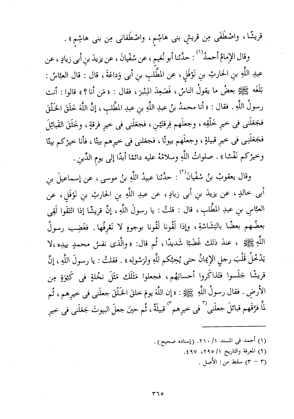 وَقَالَ يَعْقُوبُ بْنُ سُفْيَانَ: حَدَّثَنَا عُبَيْدُ اللَّهِ بْنُ مُوسَى عَنْ إِسْمَاعِيلَ بْنِ أَبِي خَالِدٍ عَنْ يَزِيدَ بْنِ أَبِي زِيَادٍ عَنْ عَبْدِ اللَّهِ بْنِ الْحَارِثِ بْنِ نَوْفَلٍ عَنِ الْعَبَّاسِ بْنِ عَبْدِ الْمُطَّلِبِ قَالَ: قُلْتُ: يَا رَسُولَ اللَّهِ إِنَّ قُرَيْشًا إِذَا الْتَقَوْا لَقِيَ بَعْضُهُمْ بَعْضًا بِالْبَشَاشَةِ، وَإِذَا لَقُونَا لَقُونَا بِوُجُوهٍ لَا نَعْرِفُهَا فَغَضِبَ رَسُولُ اللَّهِ صَلَّى اللَّهُ عَلَيْهِ وَسَلَّمَ عِنْدَ ذَلِكَ غَضَبًا شَدِيدًا، ثُمَّ قَالَ: وَالَّذِي نَفْسُ مُحَمَّدٍ بِيَدِهِ، لَا يَدْخُلُ قَلْبَ رَجُلٍ الْإِيمَانُ حَتَّى يُحِبَّكُمْ لِلَّهِ وَلِرَسُولِهِ. فَقُلْتُ: يَا رَسُولَ اللَّهِ إِنَّ قُرَيْشًا جَلَسُوا فَتَذَاكَرُوا أَحْسَابَهُمْ فَجَعَلُوا مَثَلَكَ كَمَثَلِ نَخْلَةٍ فِي كَبْوَةٍ مِنَ الْأَرْضِ فَقَالَ رَسُولُ اللَّهِ صَلَّى اللَّهُ عَلَيْهِ وَسَلَّمَ: «إِنَّ اللَّهَ يَوْمَ خَلَقَ الْخَلْقَ جَعَلَنِي فِي خَيْرِهِمْ، ثُمَّ لَمَّا فَرَّقَهُمْ قَبَائِلَ جَعَلَنِي فِي خَيْرِهِمْ قَبِيلَةً، ثُمَّ حِينَ جَعَلَ الْبُيُوتَ جَعَلَنِي فِي خَيْرِ