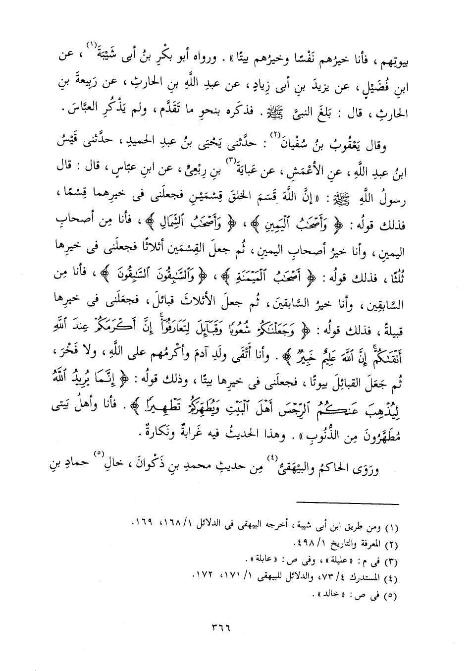 وَقَالَ يَعْقُوبُ بْنُ سُفْيَانَ حَدَّثَنِي يَحْيَى بْنُ عَبْدِ الْحَمِيدِ حَدَّثَنِي قَيْسُ بْنُ عَبْدِ اللَّهِ عَنِ الْأَعْمَشِ عَنْ عَبَايَةَ بْنِ رِبْعِيٍّ عَنِ ابْنِ عَبَّاسٍ قَالَ: قَالَ رَسُولُ اللَّهِ صَلَّى اللَّهُ عَلَيْهِ وَسَلَّمَ: «إِنَّ اللَّهَ قَسَمَ الْخَلْقَ قِسْمَيْنِ فَجَعَلَنِي فِي خَيْرِهِمَا قِسْمًا فَذَلِكَ قَوْلُهُ {وَأَصْحَابُ الْيَمِينِ} [الواقعة: 27] {وَأَصْحَابُ الشِّمَالِ} [الواقعة: 41] فَأَنَا مِنْ أَصْحَابِ الْيَمِينِ، وَأَنَا خَيْرُ أَصْحَابِ الْيَمِينِ، ثُمَّ جَعَلَ الْقِسْمَيْنِ أَثْلَاثًا فَجَعَلَنِي فِي خَيْرِهَا ثُلُثًا فَذَلِكَ قَوْلُهُ {أَصْحَابُ الْمَيْمَنَةِ} [الواقعة: 8] {وَالسَّابِقُونَ السَّابِقُونَ} [الواقعة: 10] فَأَنَا مِنَ السَّابِقِينَ وَأَنَا خَيْرُ السَّابِقِينَ، ثُمَّ جَعَلَ الْأَثْلَاثَ قَبَائِلَ فَجَعَلَنِي فِي خَيْرِهَا قَبِيلَةً فَذَلِكَ قَوْلُهُ {وَجَعَلْنَاكُمْ شُعُوبًا وَقَبَائِلَ لِتَعَارَفُوا إِنَّ أَكْرَمَكُمْ عِنْدَ اللَّهِ أَتْقَاكُمْ إِنَّ اللَّهَ عَلِيمٌ خَبِيرٌ} [الحجرات: 13] وَأَنَا أَتْقَى وَلَدِ آدَمَ وَأَكْرَمُهُمْ عَلَى اللَّهِ وَلَا فَخْرَ، ثُمَّ جَعَلَ الْقَبَائِلَ بُيُوتًا فَجَعَلَنِي فِي خَيْرِهَا بَيْتًا، وَذَلِكَ قَوْلُهُ {إِنَّمَا يُرِيدُ اللَّهُ لِيُذْهِبَ عَنْكُمُ الرِّجْسَ أَهْلَ الْبَيْتِ وَيُطَهِّرَكُمْ تَطْهِيرًا} [الأحزاب: 33] » [الْأَحْزَابِ: 33] فَأَنَا وَأَهْلُ بَيْتِي مُطَهَّرُونَ مِنَ الذُّنُوبِ. وَهَذَا الْحَدِيثُ فِيهِ غَرَابَةٌ، وَنَكَارَةٌ.