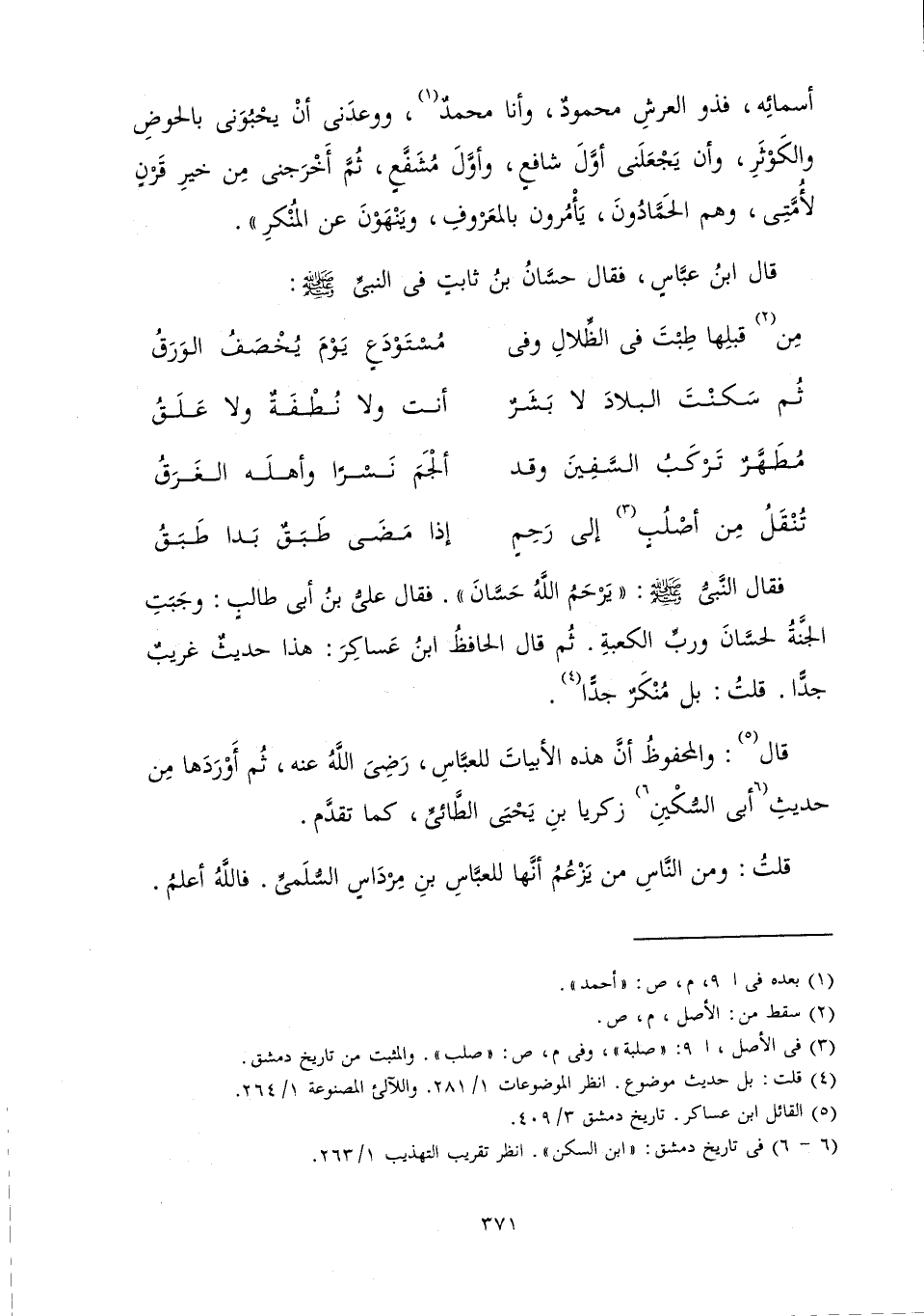 فَقَالَ النَّبِيُّ صَلَّى اللَّهُ عَلَيْهِ وَسَلَّمَ «يَرْحَمُ اللَّهُ حَسَانَ» فَقَالَ عَلِيُّ بْنُ أَبِي طَالِبٍ، وَجَبَتِ الْجَنَّةُ لِحَسَّانَ وَرَبِّ الْكَعْبَةِ. ثُمَّ قَالَ الْحَافِظُ ابْنُ عَسَاكِرَ: هَذَا حَدِيثٌ غَرِيبٌ جِدًّا قُلْتُ: بَلْ مُنْكَرٌ جِدًّا.