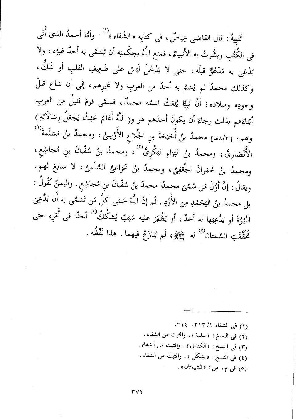 تَنْبِيهٌ: قَالَ الْقَاضِي عِيَاضٌ فِي كِتَابِهِ الشِّفَاءِ: وَأَمَّا أَحْمَدُ الَّذِي أَتَى فِي الْكُتُبِ، وَبَشَّرَتْ بِهِ الْأَنْبِيَاءُ فَمَنَعَ اللَّهُ بِحِكْمَتِهِ أَنْ يُسَمَّى بِهِ أَحَدٌ غَيْرُهُ وَلَا يُدْعَى بِهِ مَدْعُوٌّ قَبْلَهُ حَتَّى لَا يَدْخُلَ لَبْسٌ عَلَى ضَعِيفِ الْقَلْبِ أَوْ شَكٌّ، وَكَذَلِكَ مُحَمَّدٌ لَمْ يُسَمَّ بِهِ أَحَدٌ مِنَ الْعَرَبِ وَلَا غَيْرِهِمْ، إِلَى أَنْ شَاعَ قَبْلَ وُجُودِهِ وَمِيلَادِهِ، أَنَّ نَبِيًّا يُبْعَثُ اسْمُهُ مُحَمَّدٌ فَسَمَّى قَوْمٌ قَلِيلٌ مِنَ الْعَرَبِ أَبْنَاءَهُمْ بِذَلِكَ رَجَاءَ أَنْ يَكُونَ أَحَدُهُمْ هُوَ. وَاللَّهُ أَعْلَمُ حَيْثُ يَجْعَلُ رِسَالَاتَهُ وَهُمْ; مُحَمَّدُ بْنُ أُحَيْحَةَ بْنِ الْجُلَاحِ الْأَوْسِيُّ، وَمُحَمَّدُ بْنُ سَلَمَةَ الْأَنْصَارِيُّ، وَمُحَمَّدُ بْنُ الْبَرَاءِ الْكِنْدِيُّ، وَمُحَمَّدُ بْنُ سُفْيَانَ بْنِ مُجَاشِعٍ، وَمُحَمَّدُ بْنُ حُمْرَانَ الْجُعْفِيُّ، وَمُحَمَّدُ بْنُ خُزَاعِيٍّ السُّلَمِيُّ لَا سَابِعَ لَهُمْ، وَيُقَالَ: إِنَّ أَوَّلَ مَنْ سُمِّيَ مُحَمَّدًا مُحَمَّدُ بْنُ سُفْيَانَ بْنِ مُجَاشِعٍ وَالْيَمَنُ تَقُولُ: بَلْ مُحَمَّدُ بْنُ الْيَحْمُدِ مِنَ الْأَزْدِ، ثُمَّ إِنَّ اللَّهَ حَمَى كُلَّ مَنْ تَسَمَّى بِهِ أَنْ يَدَّعِيَ النُّبُوَّةَ أَوْ يَدَّعِيَهَا لَهُ أَحَدٌ أَوْ يَظْهَرَ عَلَيْهِ سَبَبٌ يُشَكِّكُ أَحَدًا فِي أَمْرِهِ حَتَّى تَحَقَّقَتِ السِّمَتَانِ لَهُ صَلَّى اللَّهُ عَلَيْهِ وَسَلَّمَ لَمْ يُنَازَعْ فِيهِمَا. هَذَا لَفْظُهُ.