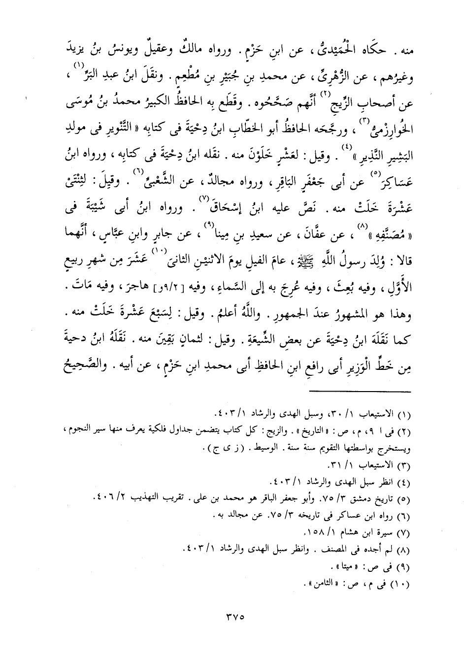 مِنْهُ. حَكَاهُ الْحُمَيْدِيُّ عَنِ ابْنِ حَزْمٍ، وَرَوَاهُ مَالِكٌ وَعُقَيْلٌ وَيُونُسُ بْنُ يَزِيدَ وَغَيْرُهُمْ عَنِ الزُّهْرِيِّ عَنْ مُحَمَّدِ بْنِ جُبَيْرِ بْنِ مُطْعِمٍ. وَنَقَلَ ابْنُ عَبْدِ الْبَرِّ عَنْ أَصْحَابِ التَّارِيخِ أَنَّهُمْ صَحَّحُوهُ، وَقَطَعَ بِهِ الْحَافِظُ الْكَبِيرُ مُحَمَّدُ بْنُ مُوسَى الْخُوَارِزْمِيُّ، وَرَجَّحَهُ الْحَافِظُ أَبُو الْخَطَّابِ ابْنُ دِحْيَةَ فِي كِتَابِهِ التَّنْوِيرِ فِي مَوْلِدِ الْبَشِيرِ النَّذِيرِ. وَقِيلَ: لِعَشْرٍ خَلَوْنَ مِنْهُ نَقَلَهُ ابْنُ دِحْيَةَ فِي كِتَابِهِ، وَرَوَاهُ ابْنُ عَسَاكِرَ عَنْ أَبِي جَعْفَرٍ الْبَاقِرِ، وَرَوَاهُ مُجَالِدٌ عَنِ الشَّعْبِيِّ كَمَا مَرَّ، وَقِيلَ: لِثِنْتَيْ عَشْرَةَ خَلَتْ مِنْهُ نَصَّ عَلَيْهِ ابْنُ إِسْحَاقَ، وَرَوَاهُ ابْنُ أَبِي شَيْبَةَ فِي مُصَنَّفِهِ عَنْ عَفَّانَ عَنْ سَعِيدِ بْنِ مِينَا عَنْ جَابِرٍ، وَابْنِ عَبَّاسٍ أَنَّهُمَا قَالَا: وُلِدَ رَسُولُ اللَّهِ صَلَّى اللَّهُ عَلَيْهِ وَسَلَّمَ عَامَ الْفِيلِ يَوْمَ الِاثْنَيْنِ الثَّانِي عَشَرَ مِنْ شَهْرِ رَبِيعٍ الْأَوَّلِ، وَفِيهِ بُعِثُ، وَفِيهِ عُرِجَ بِهِ إِلَى السَّمَاءِ، وَفِيهِ هَاجَرَ، وَفِيهِ مَاتَ. وَهَذَا هُوَ الْمَشْهُورُ عِنْدَ الْجُمْهُورِ. وَاللَّهُ أَعْلَمُ.