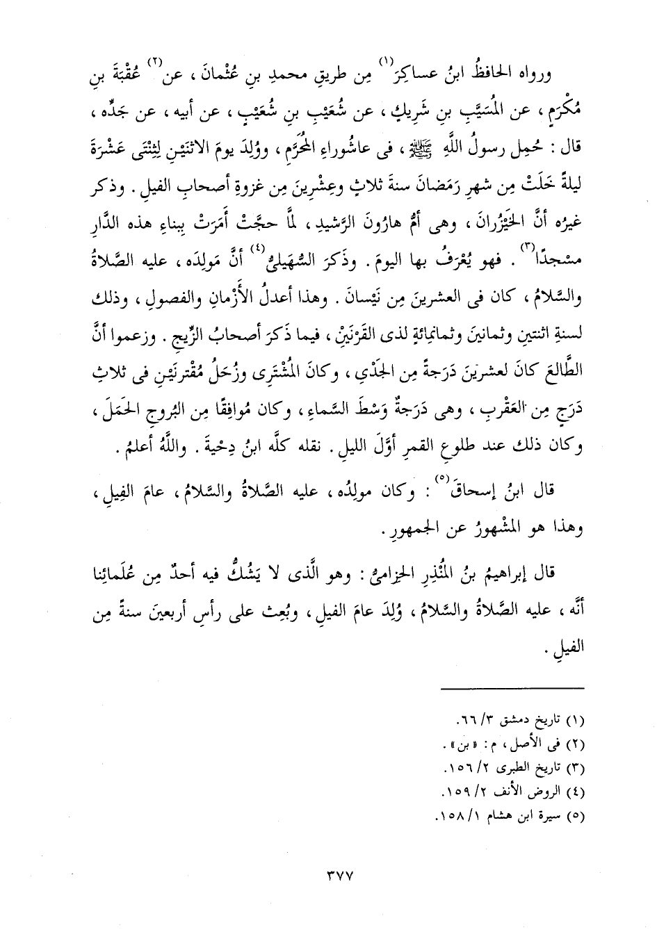 وَرَوَاهُ الْحَافِظُ ابْنُ عَسَاكِرَ مِنْ طَرِيقِ مُحَمَّدِ بْنِ عُثْمَانَ بْنِ عُقْبَةَ بْنِ مُكْرَمٍ عَنِ الْمُسَيَّبِ بْنِ شَرِيكٍ عَنْ شُعَيْبِ بْنِ شُعَيْبٍ عَنْ أَبِيهِ عَنْ جَدِّهِ قَالَ: حُمِلَ بِرَسُولِ اللَّهِ صَلَّى اللَّهُ عَلَيْهِ وَسَلَّمَ فِي عَاشُورَاءَ الْمُحَرَّمِ، وَوُلِدَ يَوْمَ الِاثْنَيْنِ لِثِنْتَيْ عَشْرَةَ لَيْلَةً خَلَتْ مِنْ شَهْرِ رَمَضَانَ، سَنَةَ ثَلَاثٍ وَعِشْرِينَ مِنْ غَزْوَةِ أَصْحَابِ الْفِيلِ. وَذَكَرَ غَيْرُهُ أَنَّ الْخَيْزُرَانَ، وَهِيَ أَمُّ هَارُونَ الرَّشِيدِ لَمَّا حَجَّتْ أَمَرَتْ بِبِنَاءِ هَذِهِ الدَّارِ مَسْجِدًا فَهُوَ يُعْرَفُ بِهَا الْيَوْمَ.