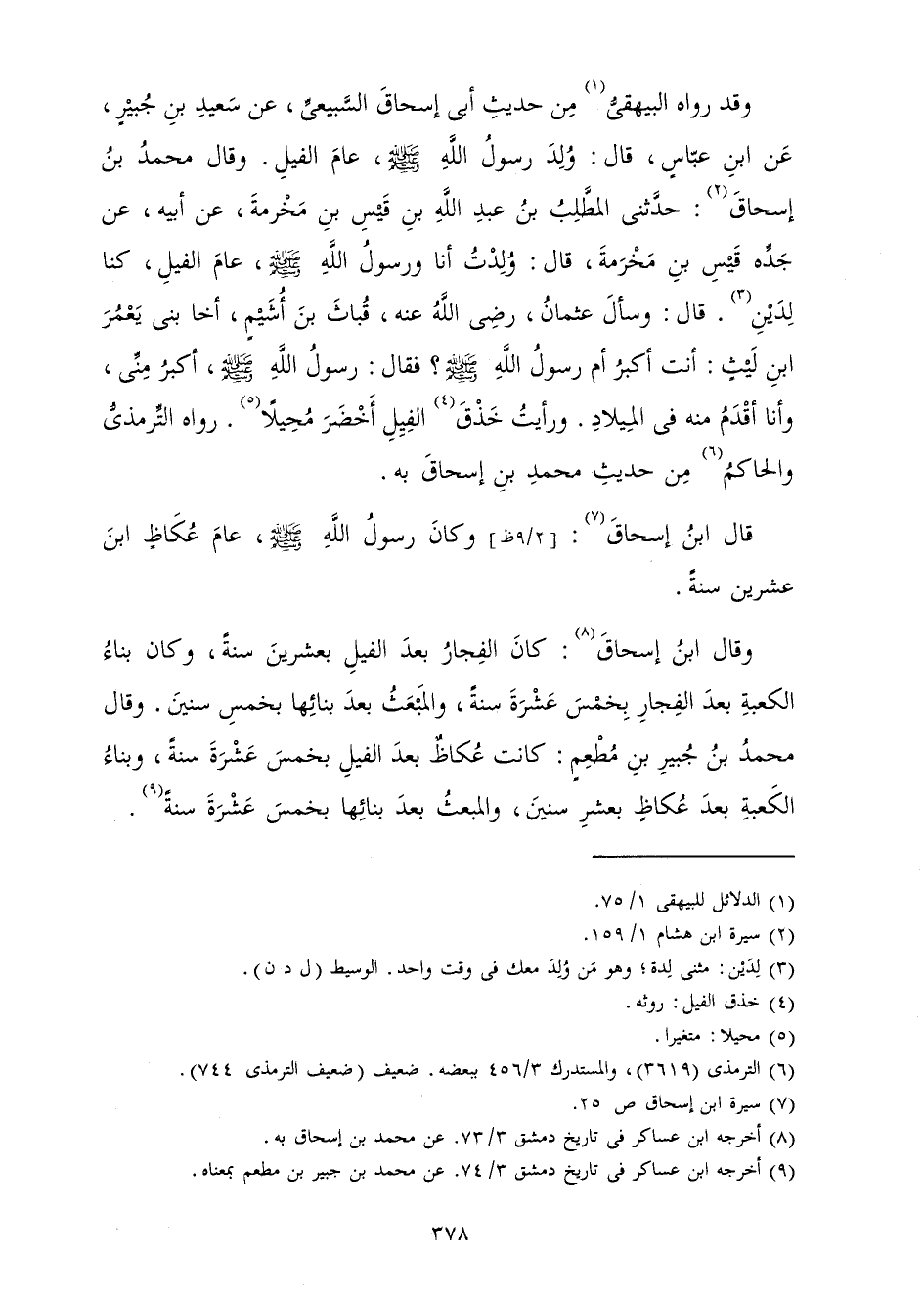 وَقَدْ رَوَاهُ الْبَيْهَقِيُّ مِنْ حَدِيثِ أَبِي إِسْحَاقَ السَّبِيعِيِّ عَنْ سَعِيدِ بْنِ جُبَيْرٍ عَنِ ابْنِ عَبَّاسٍ قَالَ وُلِدَ رَسُولُ اللَّهِ صَلَّى اللَّهُ عَلَيْهِ وَسَلَّمَ عَامَ الْفِيلِ وَقَالَ مُحَمَّدُ بْنُ إِسْحَاقَ: حَدَّثَنِي الْمُطَّلِبُ بْنُ عَبْدِ اللَّهِ بْنِ قَيْسِ بْنِ مَخْرَمَةَ عَنْ أَبِيهِ عَنْ جَدِّهِ قَيْسِ بْنِ مَخْرَمَةَ قَالَ: وُلِدْتُ أَنَا وَرَسُولُ اللَّهِ صَلَّى اللَّهُ عَلَيْهِ وَسَلَّمَ عَامَ الْفِيلِ، كُنَّا لِدَيْنِ، قَالَ: وَسَأَلَ عُثْمَانُ رَضِيَ اللَّهُ عَنْهُ قُبَاثَ بْنَ أُشْيَمٍ أَخَا بَنِي يَعْمُرَ بْنِ لَيْثٍ: أَنْتَ أَكْبَرُ أَمْ رَسُولُ اللَّهِ صَلَّى اللَّهُ عَلَيْهِ وَسَلَّمَ فَقَالَ: رَسُولُ اللَّهِ صَلَّى اللَّهُ عَلَيْهِ وَسَلَّمَ أَكْبَرُ مِنِّي، وَأَنَا أَقْدَمُ مِنْهُ فِي الْمِيلَادِ، وَرَأَيْتُ خَذْقَ الْفِيلِ أَخْضَرَ مُحِيلًا وَرَوَاهُ التِّرْمِذِيُّ وَالْحَاكِمُ مِنْ حَدِيثِ مُحَمَّدِ بْنِ إِسْحَاقَ بِهِ.