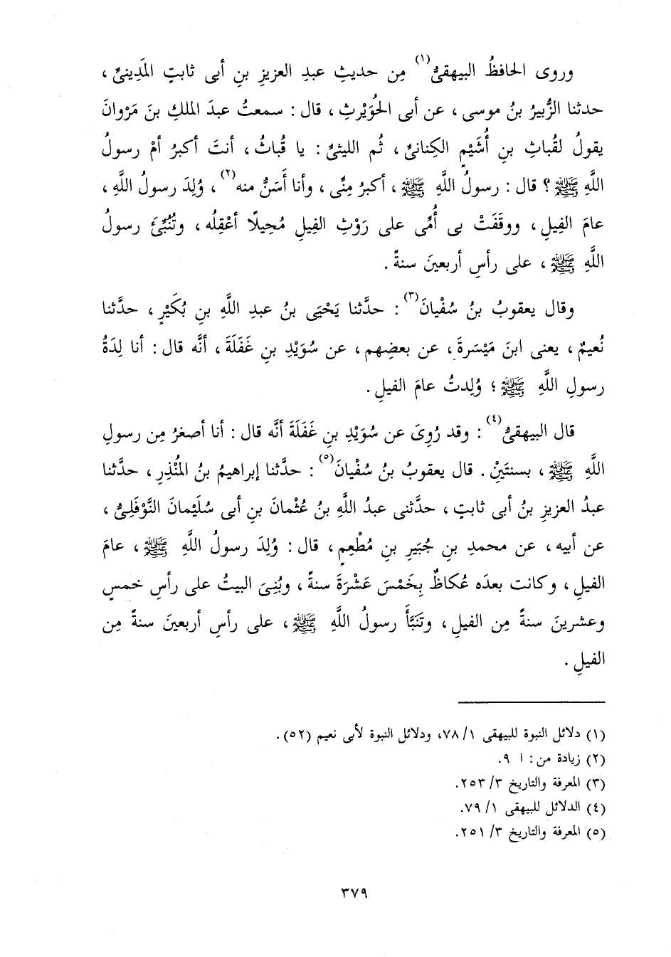 وَقَالَ يَعْقُوبُ بْنُ سُفْيَانَ: حَدَّثَنَا يَحْيَى بْنُ عَبْدِ اللَّهِ بْنِ بُكَيْرٍ حَدَّثَنَا نُعَيْمٌ يَعْنِي ابْنَ مَيْسَرَةَ عَنْ بَعْضِهِمْ عَنْ سُوَيْدِ بْنِ غَفَلَةَ أَنَّهُ قَالَ: أَنَا لِدَةُ رَسُولِ اللَّهِ صَلَّى اللَّهُ عَلَيْهِ وَسَلَّمَ. وُلِدْتُ عَامَ الْفِيلِ قَالَ الْبَيْهَقِيُّ وَقَدْ رُوِيَ عَنْ سُوَيْدِ بْنِ غَفَلَةَ أَنَّهُ قَالَ: أَنَا أَصْغَرُ مِنْ رَسُولِ اللَّهِ صَلَّى اللَّهُ عَلَيْهِ وَسَلَّمَ بِسَنَتَيْنِ قَالَ يَعْقُوبُ بْنُ سُفْيَانَ: حَدَّثَنَا إِبْرَاهِيمُ بْنُ الْمُنْذِرِ حَدَّثَنَا عَبْدُ الْعَزِيزِ بْنُ أَبِي ثَابِتٍ حَدَّثَنِي عَبْدُ اللَّهِ بْنُ عُثْمَانَ بْنِ أَبِي سُلَيْمَانَ النَّوْفَلِيُّ عَنْ أَبِيهِ عَنْ مُحَمَّدِ بْنِ جُبَيْرِ بْنِ مُطْعِمٍ قَالَ: وُلِدَ رَسُولُ اللَّهِ صَلَّى اللَّهُ عَلَيْهِ وَسَلَّمَ عَامَ الْفِيلِ، وَكَانَتْ بَعْدَهُ عُكَاظٌ بِخَمْسَ عَشْرَةَ سَنَةً، وَبُنِيَ الْبَيْتُ عَلَى رَأْسِ خَمْسٍ وَعِشْرِينَ سَنَةً مِنَ الْفِيلِ، وَتَنَبَّأَ رَسُولُ اللَّهِ صَلَّى اللَّهُ عَلَيْهِ وَسَلَّمَ عَلَى رَأْسِ أَرْبَعِينَ سَنَةً مِنَ الْفِيلِ.