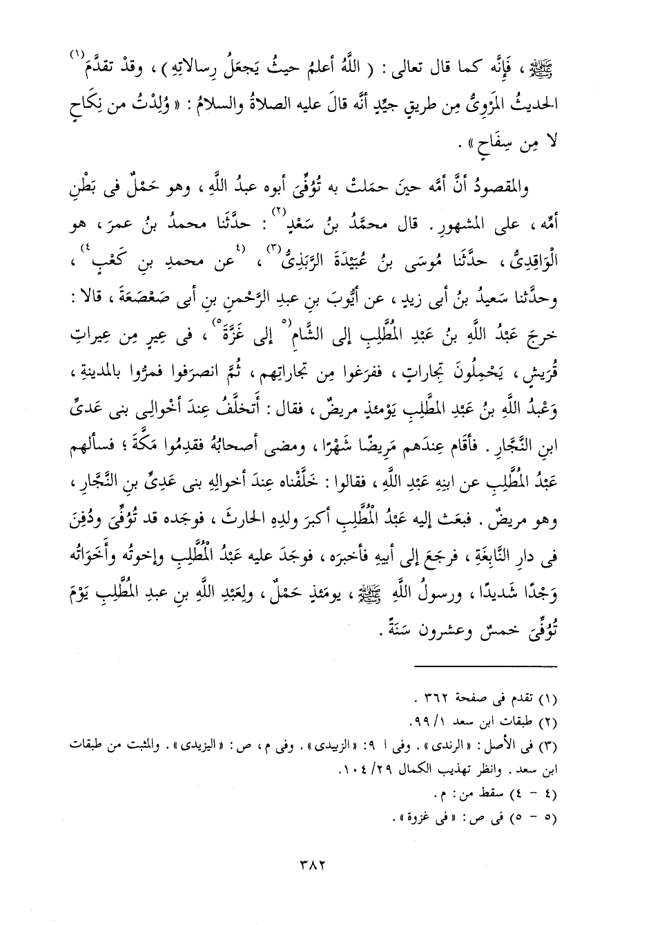 وَالْمَقْصُودُ أَنَّ أُمَّهُ حِينَ حَمَلَتْ بِهِ تُوُفِّيَ أَبُوهُ عَبْدُ اللَّهِ وَهُوَ حَمْلٌ فِي بَطْنِ أُمِّهِ، عَلَى الْمَشْهُورِ قَالَ مُحَمَّدُ بْنُ سَعْدٍ: حَدَّثَنَا مُحَمَّدُ بْنُ عُمَرَ هُوَ الْوَاقِدِيُّ حَدَّثَنَا مُوسَى بْنُ عُبَيْدَةَ الرَّبَذِيُّ وَعَنْ مُحَمَّدِ بْنِ كَعْبٍ وَحَدَّثَنَا سَعِيدُ بْنُ أَبِي زَيْدٍ عَنْ أَيُّوبَ بْنِ عَبْدِ الرَّحْمَنِ بْنِ أَبِي صَعْصَعَةَ قَالَا: خَرَجَ عَبْدُ اللَّهِ بْنُ عَبْدِ الْمُطَّلِبِ إِلَى الشَّامِ إِلَى غَزَّةَ فِي عِيرٍ مِنْ عِيرَاتِ قُرَيْشٍ يُحَمِّلُونَهُ تِجَارَاتٍ فَفَرَغُوا مِنْ تِجَارَتِهِمْ، ثُمَّ انْصَرَفُوا فَمَرُّوا بِالْمَدِينَةِ، وَعَبْدُ اللَّهِ بْنُ عَبْدِ الْمُطَّلِبِ يَوْمَئِذٍ مَرِيضٌ فَقَالَ: أَتَخَلَّفُ عِنْدَ أَخْوَالِي بَنِي عَدِيِّ بْنِ النَّجَّارِ فَأَقَامَ عِنْدَهُمْ مَرِيضًا شَهْرًا، وَمَضَى أَصْحَابُهُ فَقَدِمُوا مَكَّةَ فَسَأَلَهُمْ عَبْدُ الْمُطَّلِبِ عَنِ ابْنِهِ عَبْدِ اللَّهِ فَقَالُوا: خَلَّفْنَاهُ عِنْدَ أَخْوَالِهِ بَنِي عَدِيِّ بْنِ النَّجَّارِ وَهُوَ مَرِيضٌ فَبَعَثَ إِلَيْهِ عَبْدُ الْمُطَّلِبِ أَكْبَرَ وَلَدِهِ الْحَارِثَ فَوَجَدَهُ قَدْ تُوُفِّيَ وَدُفِنَ فِي دَارِ النَّابِغَةِ فَرَجَعَ إِلَى أَبِيهِ فَأَخْبَرَهُ فَوَجَدَ عَلَيْهِ عَبْدُ الْمُطَّلِبِ وَإِخْوَتُهُ وَأَخَوَاتُهُ وَجْدًا شَدِيدًا، وَرَسُولُ اللَّهِ صَلَّى اللَّهُ عَلَيْهِ وَسَلَّمَ يَوْمَئِذٍ حَمْلٌ، وَلِعَبْدِ اللَّهِ بْنِ عَبْدِ الْمُطَّلِبِ يَوْمَ تُوُفِّيَ خَمْسٌ وَعِشْرُونَ سَنَةً.