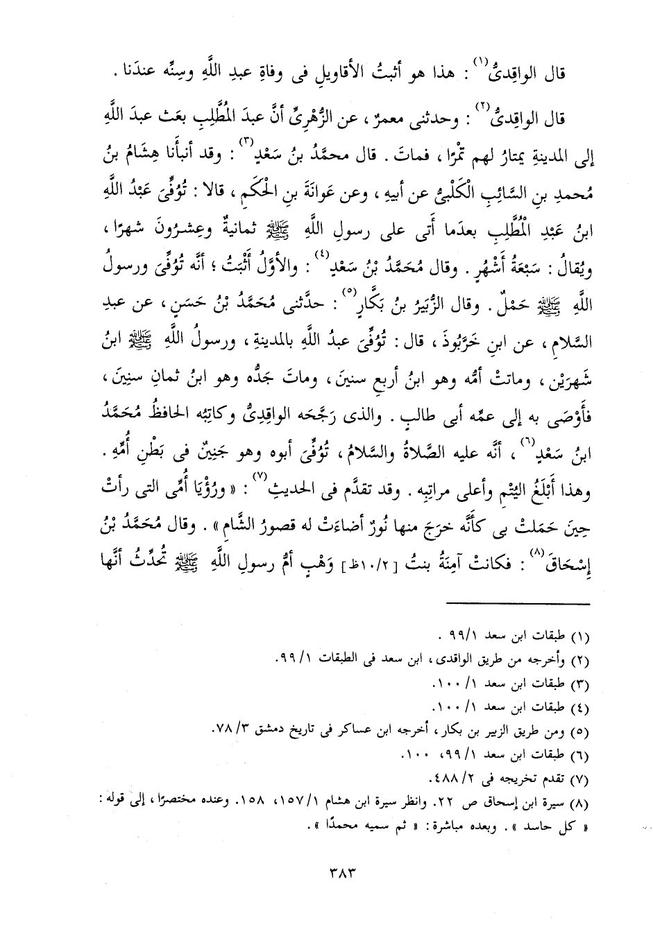 قَالَ الْوَاقِدِيُّ: هَذَا هُوَ أَثْبَتُ الْأَقَاوِيلِ فِي وَفَاةِ عَبْدِ اللَّهِ وَسِنِّهِ عِنْدَنَا. قَالَ الْوَاقِدِيُّ: وَحَدَّثَنِي مَعْمَرٌ عَنِ الزُّهْرِيِّ أَنَّ عَبْدَ الْمُطَّلِبِ بَعَثَ عَبْدَ اللَّهِ إِلَى الْمَدِينَةِ يَمْتَارُ لَهُمْ تَمْرًا فَمَاتَ قَالَ مُحَمَّدُ بْنُ سَعْدٍ: وَقَدْ أَنْبَأَنَا هِشَامُ بْنُ مُحَمَّدِ بْنِ السَّائِبِ الْكَلْبِيُّ عَنْ أَبِيهِ، وَعَنْ عَوَانَةَ بْنِ الْحَكَمِ قَالَا: تُوُفِّيَ عَبْدُ اللَّهِ بْنُ عَبْدِ الْمُطَّلِبِ بَعْدَمَا أَتَى عَلَى رَسُولِ اللَّهِ صَلَّى اللَّهُ عَلَيْهِ وَسَلَّمَ ثَمَانِيَةٌ وَعِشْرُونَ شَهْرًا، وَقِيلَ: سَبْعَةُ أَشْهُرٍ، وَقَالَ مُحَمَّدُ بْنُ سَعْدٍ: وَالْأَوَّلُ أَثْبَتُ؛ أَنَّهُ تُوُفِّيَ، وَرَسُولُ اللَّهِ صَلَّى اللَّهُ عَلَيْهِ وَسَلَّمَ حَمْلٌ. وَقَالَ الزُّبَيْرُ بْنُ بَكَّارٍ حَدَّثَنِي مُحَمَّدُ بْنُ حَسَنٍ عَنْ عَبْدِ السَّلَامِ عَنِ ابْنِ خَرَّبُوذَ قَالَ: تُوُفِّيَ عَبْدُ اللَّهِ بِالْمَدِينَةِ، وَرَسُولُ اللَّهِ صَلَّى اللَّهُ عَلَيْهِ وَسَلَّمَ ابْنُ شَهْرَيْنِ، وَمَاتَتْ أُمُّهُ وَهُوَ ابْنُ أَرْبَعِ سِنِينَ، وَمَاتَ جَدُّهُ وَهُوَ ابْنُ ثَمَانِ سِنِينَ فَأَوْصَى بِهِ إِلَى عَمِّهِ أَبِي طَالِبٍ وَالَّذِي رَجَّحَهُ الْوَاقِدِيُّ، وَكَاتِبُهُ الْحَافِظُ مُحَمَّدُ بْنُ سَعْدٍ أَنَّهُ عَلَيْهِ الصَّلَاةُ وَالسَّلَامُ، تُوُفِّيَ أَبُوهُ وَهُوَ جَنِينٌ فِي بَطْنِ أُمِّهِ. وَهَذَا أَبْلَغُ الْيُتْمِ، وَأَعْلَى مَرَاتِبِهِ وَقَدْ تَقَدَّمَ فِي الْحَدِيثِ «، وَرُؤْيَا أُمَّيِ الَّذِي رَأَتْ حِينَ حَمَلَتْ بِي كَأَنَّهُ خَرَجَ مِنْهَا نُورٌ أَضَاءَتْ لَهُ قُصُورُ الشَّامِ» وَقَالَ مُحَمَّدُ بْنُ إِسْحَاقَ: فَكَانَتْ آمِنَةُ بِنْتُ وَهْبٍ أُمُّ رَسُولِ اللَّهِ صَلَّى اللَّهُ عَلَيْهِ وَسَلَّمَ تُحَدِّثُ أَنَّهَا
