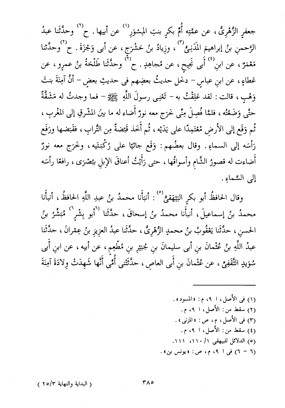 جَعْفَرٍ الزُّهْرِيُّ عَنْ عَمَّتِهِ أُمِّ بَكْرٍ بِنْتِ الْمِسْوَرِ عَنْ أَبِيهَا، ح وَحَدَّثَنَا عَبْدُ الرَّحْمَنِ بْنُ إِبْرَاهِيمَ الْمَدَنِيُّ، وَزِيَادُ بْنُ حَشْرَجٍ عَنْ أَبِي، وَجْزَةَ ح، وَحَدَّثَنَا مَعْمَرٌ عَنْ أَبِي نَجِيحٍ عَنْ مُجَاهِدٍ ح، وَحَدَّثَنَا طَلْحَةُ بْنُ عَمْرٍو عَنْ عَطَاءٍ عَنِ ابْنِ عَبَّاسٍ - دَخَلَ حَدِيثُ بَعْضِهِمْ فِي حَدِيثِ بَعْضٍ - أَنَّ آمِنَةَ بِنْتَ وَهْبٍ قَالَتْ: لَقَدْ عَلِقْتُ بِهِ - تَعْنِي رَسُولَ اللَّهِ صَلَّى اللَّهُ عَلَيْهِ وَسَلَّمَ - فَمَا وَجَدْتُ لَهُ مَشَقَّةً حَتَّى وَضَعْتُهُ فَلَمَّا فَصَلَ مِنِّي خَرَجَ مَعَهُ نُورٌ أَضَاءَ لَهُ مَا بَيْنَ الْمَشْرِقِ إِلَى الْمَغْرِبِ ثُمَّ وَقَعَ إِلَى الْأَرْضِ مُعْتَمِدًا عَلَى يَدَيْهِ، ثُمَّ أَخَذَ قَبْضَةً مِنَ التُّرَابِ فَقَبَضَهَا، وَرَفَعَ رَأَسَهُ إِلَى السَّمَاءِ، وَقَالَ بَعْضُهُمْ: وَقَعَ جَاثِيًا عَلَى رُكْبَتَيْهِ، وَخَرَجَ مَعَهُ نُورٌ أَضَاءَتْ لَهُ قُصُورُ الشَّامِ، وَأَسْوَاقُهَا حَتَّى رَأَيْتُ أَعْنَاقَ الْإِبِلِ بِبُصْرَى رَافِعًا رَأْسَهُ إِلَى السَّمَاءِ.