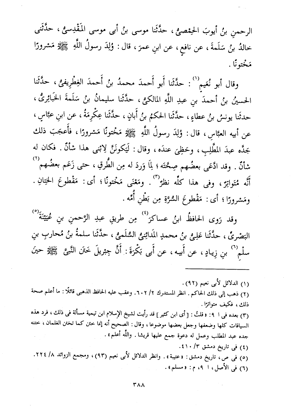 وَقَالَ أَبُو نُعَيْمٍ: حَدَّثَنَا أَبُو أَحْمَدَ مُحَمَّدُ بْنُ أَحْمَدَ الْغِطْرِيفِيُّ حَدَّثَنَا الْحُسَيْنُ بْنُ أَحْمَدَ بْنِ عَبْدِ اللَّهِ الْمَالِكِيُّ حَدَّثَنَا سُلَيْمَانُ بْنُ سَلَمَةَ الْخَبَائِرِيُّ حَدَّثَنَا يُونُسُ بْنُ عَطَاءٍ حَدَّثَنَا الْحَكَمُ بْنُ أَبَانٍ حَدَّثَنَا عِكْرِمَةُ عَنِ ابْنِ عَبَّاسٍ عَنْ أَبِيهِ الْعَبَّاسِ قَالَ: وُلِدَ رَسُولُ اللَّهِ صَلَّى اللَّهُ عَلَيْهِ وَسَلَّمَ مَخْتُونًا مَسْرُورًا فَأَعْجَبَ ذَلِكَ جَدَّهُ عَبْدَ الْمُطَّلِبِ وَحَظِيَ عِنْدَهُ، وَقَالَ: لَيَكُونَنَّ لِابْنِي هَذَا شَأْنٌ فَكَانَ لَهُ شَأْنٌ. وَقَدِ ادَّعَى بَعْضُهُمْ صِحَّتَهُ لِمَا وَرَدَ لَهُ مِنَ الطُّرُقِ حَتَّى زَعَمَ بَعْضُهُمْ أَنَّهُ مُتَوَاتِرٌ، وَفِي هَذَا كُلِّهِ نَظَرٌ. وَمَعْنًى مَخْتُونًا أَيْ: مَقْطُوعَ الْخِتَانِ، وَمَسْرُورًا أَيْ: مَقْطُوعَ السُّرَّةِ مِنْ بَطْنِ أُمِّهِ.