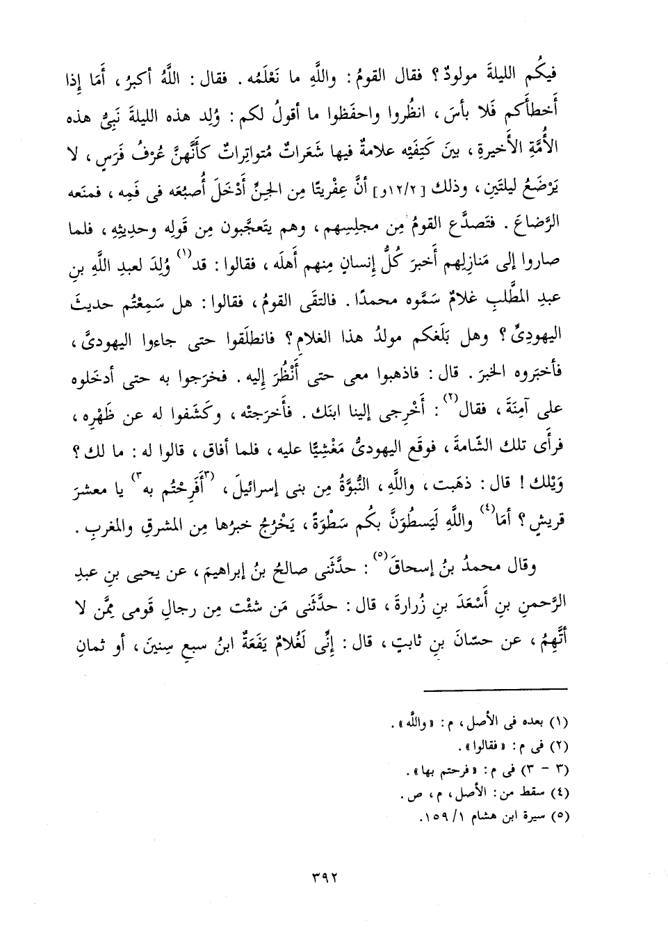 فِيكُمُ اللَّيْلَةَ مَوْلُودٌ؟ فَقَالَ الْقَوْمُ: وَاللَّهِ مَا نَعْلَمُهُ. فَقَالَ: اللَّهُ أَكْبَرُ أَمَا إِذَا أَخْطَأَكُمْ فَلَا بَأْسَ، انْظُرُوا وَاحْفَظُوا مَا أَقُولُ لَكُمْ: وُلِدَ هَذِهِ اللَّيْلَةَ نَبِيُّ هَذِهِ الْأُمَّةِ الْأَخِيرَةِ بَيْنَ كَتِفَيْهِ عَلَامَةٌ فِيهَا شَعَرَاتٌ مُتَوَاتِرَاتٌ كَأَنَّهُنَّ عُرْفُ فَرَسٍ، لَا يَرْضَعُ لَيْلَتَيْنِ; وَذَلِكَ أَنَّ عِفْرِيتًا مِنَ الْجِنِّ أَدْخَلَ أُصْبُعَهُ فِي فَمِهِ فَمَنَعَهُ الرَّضَاعَ فَتَصَدَّعَ الْقَوْمُ مِنْ مَجْلِسِهِمْ، وَهُمْ يَتَعَجَّبُونَ مِنْ قَوْلِهِ وَحَدِيثِهِ فَلَمَّا صَارُوا إِلَى مَنَازِلِهِمْ أَخْبَرَ كُلُّ إِنْسَانٍ مِنْهُمْ أَهْلَهُ فَقَالُوا: قَدْ وَاللَّهِ وُلِدَ لِعَبْدِ اللَّهِ بْنِ عَبْدِ الْمُطَّلِبِ غُلَامٌ سَمَّوْهُ مُحَمَّدًا فَالْتَقَى الْقَوْمُ فَقَالُوا: هَلْ سَمِعْتُمْ حَدِيثَ الْيَهُودِيِّ؟ وَهَلْ بَلَغَكُمْ مَوْلِدُ هَذَا الْغُلَامِ؟ فَانْطَلَقُوا حَتَّى جَاءُوا الْيَهُودِيَّ فَأَخْبَرُوهُ الْخَبَرَ. قَالَ: فَاذْهَبُوا مَعِيَ حَتَّى أَنْظُرَ إِلَيْهِ فَخَرَجُوا بِهِ حَتَّى أَدْخَلُوهُ عَلَى آمِنَةَ فَقَالُوا: أَخْرِجِي إِلَيْنَا ابْنَكِ فَأَخْرَجَتْهُ، وَكَشَفُوا لَهُ عَنْ ظَهْرِهِ فَرَأَى تِلْكَ الشَّامَةَ فَوَقَعَ الْيَهُودِيُّ مَغْشِيًّا عَلَيْهِ فَلَمَّا أَفَاقَ قَالُوا لَهُ: مَا لَكَ؟ وَيْلَكَ! قَالَ: قَدْ ذَهَبَتْ وَاللَّهِ النُّبُوَّةُ مِنْ بَنِي إِسْرَائِيلَ، أَفَرِحْتُمْ بِهَا يَا مَعْشَرَ قُرَيْشٍ؟ وَاللَّهِ لَيَسْطُوَنَّ بِكُمْ سَطْوَةً يَخْرُجُ خَبَرُهَا مِنَ الْمَشْرِقِ وَالْمَغْرِبِ.