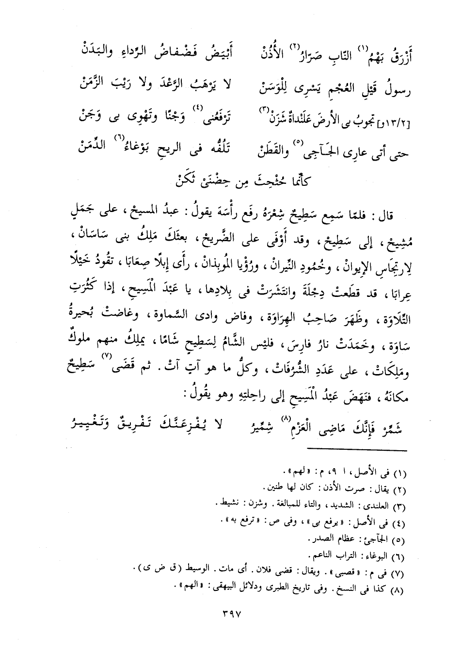 قَالَ: فَلَمَّا سَمِعَ سَطِيحٌ شِعْرَهُ رَفَعَ رَأْسَهُ: يَقُولُ عَبْدُ الْمَسِيحِ عَلَى جَمَلٍ مُشِيحْ أَتَى سَطِيحْ، وَقَدْ أَوْفَى عَلَى الضَّرِيحْ، بَعَثَكَ مَلِكُ بَنِي سَاسَانْ لِارْتِجَاسِ الْإِيوَانْ، وَخُمُودِ النِّيرَانْ، وَرُؤْيَا الْمُوبِذَانْ; رَأَى إِبِلًا صِعَابًا تَقُودُ خَيْلًا عِرَابًا قَدْ قَطَعَتْ دِجْلَةَ، وَانْتَشَرَتْ فِي بِلَادِهَا يَا عَبْدَ الْمَسِيحِ، إِذَا كَثُرَتِ التِّلَاوَةُ، وَظَهَرَ صَاحِبُ الْهِرَاوَةِ، وَفَاضَ وَادِي السَّمَاوَةِ، وَغَاضَتْ بُحَيْرَةُ سَاوَةَ، وَخَمَدَتْ نَارُ فَارِسَ فَلَيْسَ الشَّامُ لِسَطِيحٍ شَامًا يَمْلِكُ مِنْهُمْ مُلُوكٌ، وَمَلِكَاتْ عَلَى عَدَدِ الشُّرُفَاتْ، وَكُلَّمَا هُوَ آتٍ آتْ. ثُمَّ قَضَىَ سَطِيحٌ مَكَانَهُ فَنَهَضَ عَبْدُ الْمَسِيحِ إِلَى رَاحِلَتِهِ وَهُوَ يَقُولُ: