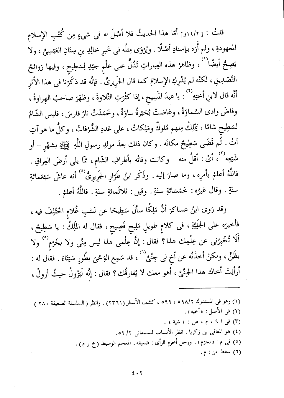 قُلْتُ: أَمَّا هَذَا الْحَدِيثُ فَلَا أَصْلَ لَهُ فِي شَيْءٍ مِنْ كُتُبِ الْإِسْلَامِ الْمَعْهُودَةِ، وَلَمْ أَرَهُ بِإِسْنَادٍ أَصْلًا، وَيُرْوَى مِثْلُهُ فِي خَبَرِ خَالِدِ بْنِ سِنَانٍ الْعَبْسِيِّ وَلَا يَصِحُّ أَيْضًا. وَظَاهِرُ هَذِهِ الْعِبَارَاتِ تَدُلُّ عَلَى عِلْمٍ جَيِّدٍ لِسَطِيحٍ، وَفِيهَا رَوَائِحُ التَّصْدِيقِ لَكِنَّهُ لَمْ يُدْرِكِ الْإِسْلَامَ كَمَا قَالَ الْجَرِيرِيُّ فَإِنَّهُ قَدْ ذَكَرْنَا فِي هَذَا الْأَثَرِ أَنَّهُ قَالَ لِابْنِ أُخْتِهِ: يَا عَبْدَ الْمَسِيحِ إِذَا كَثُرَتِ التِّلَاوَةْ، وَظَهْرَ صَاحِبُ الْهِرَاوَةْ، وَفَاضَ وَادِي السَّمَاوَةْ، وَغَاضَتْ بُحَيْرَةُ سَاوَةْ، وَخَمَدَتْ نَارُ فَارِسَ فَلَيْسَ الشَّامُ لِسَطِيحٍ شَامًا، يَمَلِكُ مِنْهُمْ مُلُوكٌ، وَمَلِكَاتْ عَلَى عَدَدِ الشُّرُفَاتْ، وَكُلُّ مَا هُوَ آتٍ آتْ، ثُمَّ قَضَى سَطِيحٌ مَكَانَهُ. وَكَانَ ذَلِكَ بَعْدَ مَوْلِدِ رَسُولِ اللَّهِ صَلَّى اللَّهُ عَلَيْهِ وَسَلَّمَ بِشَهْرٍ - أَوْ شَيْعِهِ أَيْ أَقَلَّ مِنْهُ - وَكَانَتْ وَفَاتُهُ بِأَطْرَافِ الشَّامِ مِمَّا يَلِي أَرْضَ الْعِرَاقِ فَاللَّهُ أَعْلَمُ بِأَمْرِهِ وَمَا صَارَ إِلَيْهِ، وَذَكَرَ ابْنُ طَرَّارٍ الْجَرِيرِيُّ أَنَّهُ عَاشَ سَبْعَمِائَةِ سَنَةٍ، وَقَالَ غَيْرُهُ: خَمْسَمِائَةِ سَنَةٍ، وَقِيلَ ثَلَاثَمِائَةِ سَنَةٍ فَاَللَّهُ أَعْلَمُ.