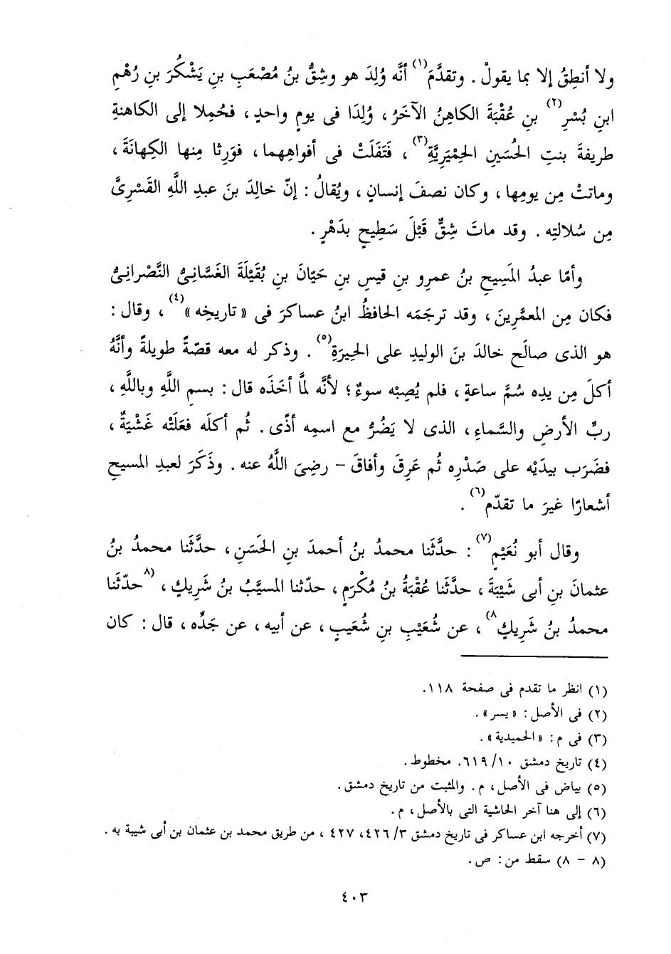 وَأَمَّا عَبْدُ الْمَسِيحِ بْنُ عَمْرِو بْنِ قَيْسِ بْنِ حَيَّانَ بْنِ بُقَيْلَةَ الْغَسَّانِيُّ النَّصْرَانِيُّ فَكَانَ مِنِ الْمُعَمَّرِينَ وَقَدْ تَرْجَمَهُ الْحَافِظُ ابْنُ عَسَاكِرَ فِي تَارِيخِهِ، وَقَالَ: هُوَ الَّذِي صَالَحَ خَالِدَ بْنَ الْوَلِيدِ عَلَى الْحِيرَةِ، وَذَكَرَ لَهُ مَعَهُ قِصَّةً طَوِيلَةً، وَأَنَّهُ أَكَلَ مِنْ يَدِهِ سُمَّ سَاعَةٍ فَلَمْ يُصِبْهُ سُوءٌ; لِأَنَّهُ لَمَّا أَخَذَهُ قَالَ: بِسْمِ اللَّهِ وَبِاللَّهِ رَبِّ الْأَرْضِ وَالسَّمَاءِ الَّذِي لَا يَضُرُّ مَعَ اسْمِهِ أَذًى، ثُمَّ أَكَلَهُ فَعَلَتْهُ غَشْيَةٌ فَضَرَبَ بِيَدَيْهِ عَلَى صَدْرِهِ، ثُمَّ عَرِقَ وَأَفَاقَ - رَضِيَ اللَّهُ عَنْهُ، وَذَكَرَ لِعَبْدِ الْمَسِيحِ أَشْعَارًا غَيْرَ مَا تَقَدَّمَ.