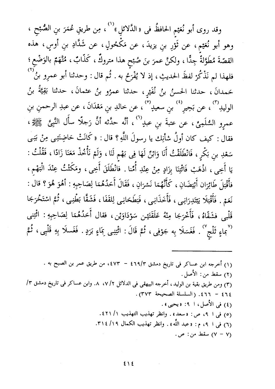 وَقَدْ رَوَى أَبُو نُعَيْمٍ الْحَافِظُ فِي الدَّلَائِلِ مِنْ طَرِيقِ عُمَرَ بْنِ الصُّبْحٍ وَهُوَ أَبُو نُعَيْمٍ عَنْ ثَوْرِ بْنِ يَزِيدَ عَنْ مَكْحُولٍ عَنْ شَدَّادِ بْنِ أَوْسٍ هَذِهِ الْقِصَّةَ مُطَوَّلَةً جِدًّا، وَلَكِنَّ عُمَرَ بْنَ صُبْحٍ هَذَا مَتْرُوكٌ كَذَّابٌ مُتَّهَمٌ بِالْوَضْعِ; فَلِهَذَا لَمْ نَذْكُرْ لَفْظَ الْحَدِيثِ إِذْ لَا يُفْرَحُ بِهِ، ثُمَّ قَالَ: وَحَدَّثَنَا أَبُو عَمْرِو بْنُ حَمْدَانَ حَدَّثَنَا الْحَسَنُ بْنُ نُفَيْرٍ حَدَّثَنَا عَمْرُو بْنُ عُثْمَانَ حَدَّثَنَا بَقِيَّةُ بْنُ الْوَلِيدِ عَنْ بَحِيرِ بْنِ سَعِيدٍ عَنْ خَالِدِ بْنِ مَعْدَانَ عَنْ عَبْدِ الرَّحْمَنِ بْنِ عَمْرٍو السُّلَمِيِّ عَنْ عُتْبَةَ بْنِ عَبْدٍ أَنَّهُ حَدَّثَهُ أَنَّ رَجُلًا سَأَلَ النَّبِيَّ صَلَّى اللَّهُ عَلَيْهِ وَسَلَّمَ فَقَالَ كَيْفَ كَانَ أَوَّلُ شَأْنِكَ يَا رَسُولَ اللَّهِ؟ قَالَ: «كَانَتْ حَاضِنَتِي مِنْ بَنِي سَعْدِ بْنِ بَكْرٍ فَانْطَلَقْتُ أَنَا وَابْنٌ لَهَا فِي بَهْمٍ لَنَا، وَلَمْ نَأْخُذْ مَعَنَا زَادًا فَقُلْتُ: يَا أَخِي اذْهَبْ فَائْتِنَا بِزَادٍ مِنْ عِنْدِ أُمِّنَا فَانْطَلَقَ أَخِي وَمَكَثْتُ عِنْدَ الْبَهْمِ فَأَقْبَلَ طَائِرَانِ أَبْيَضَانِ كَأَنَّهُمَا نَسْرَانِ فَقَالَ أَحَدُهُمَا لِصَاحِبِهِ: أَهْوَ هُوَ؟ فَقَالَ: نَعَمْ. فَأَقْبَلَا يَبْتَدِرَانِي فَأَخَذَانِي فَبَطَحَانِي لِلْقَفَا فَشَقَّا بَطْنِي، ثُمَّ اسْتَخْرَجَا قَلْبِي فَشَقَّاهُ فَأَخْرَجَا مِنْهُ عَلْقَتَيْنِ سَوْدَاوَيْنِ فَقَالَ أَحَدُهُمَا لِصَاحِبِهِ: ائْتِنِي بِمَاءٍ ثَلْجٍ فَغَسَلَا بِهِ جَوْفِي، ثُمَّ قَالَ: ائْتِنِي بِمَاءٍ بَرَدٍ فَغَسَلَا بِهِ قَلْبِي، ثُمَّ