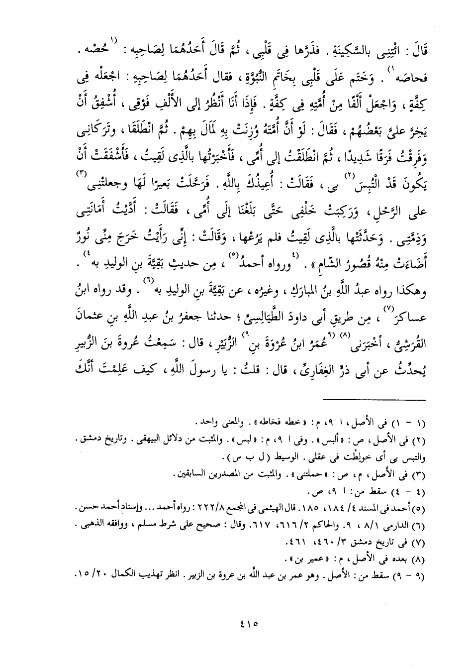فَقَالَتْ: أُعِيذُكَ بِاللَّهِ فَرَحَّلَتْ بَعِيرًا لَهَا، وَحَمَلَتْنِي عَلَى الرَّحْلِ، وَرَكِبَتْ خَلَفِي حَتَّى بَلَغْنَا إِلَى أُمِّي فَقَالَتْ أَدَّيْتُ أَمَانَتِي وَذِمَّتِي، وَحَدَّثَتْهَا بِالَّذِي لَقِيتْ فَلَمْ يَرُعْهَا، وَقَالَتْ: إِنِّي رَأَيْتُ خَرَجَ مِنِّي نُورٌ أَضَاءَتْ مِنْهُ قُصُورُ الشَّامِ» . وَرَوَاهُ أَحْمَدُ مِنْ حَدِيثِ بَقِيَّةَ بْنِ الْوَلِيدِ بِهِ. وَهَكَذَا رَوَاهُ عَبْدُ اللَّهِ بْنُ الْمُبَارَكِ وَغَيْرُهُ عَنْ بَقِيَّةَ بْنِ الْوَلِيدِ بِهِ. وَقَدْ رَوَاهُ ابْنُ عَسَاكِرَ مِنْ طَرِيقِ أَبِي دَاوُدَ الطَّيَالِسِيِّ حَدَّثَنَا جَعْفَرُ بْنُ عَبْدِ اللَّهِ بْنِ عُثْمَانَ الْقُرَشِيُّ أَخْبَرَنِي عُمَرُ بْنُ عُرْوَةَ بْنِ الزُّبَيْرِ قَالَ «سَمِعْتُ عُرْوَةَ بْنَ الزُّبَيْرِ يُحَدِّثُ عَنْ أَبِي ذَرٍّ الْغِفَارِيِّ قَالَ: قُلْتُ: يَا رَسُولَ اللَّهِ كَيْفَ عَلِمْتَ أَنَّكَ