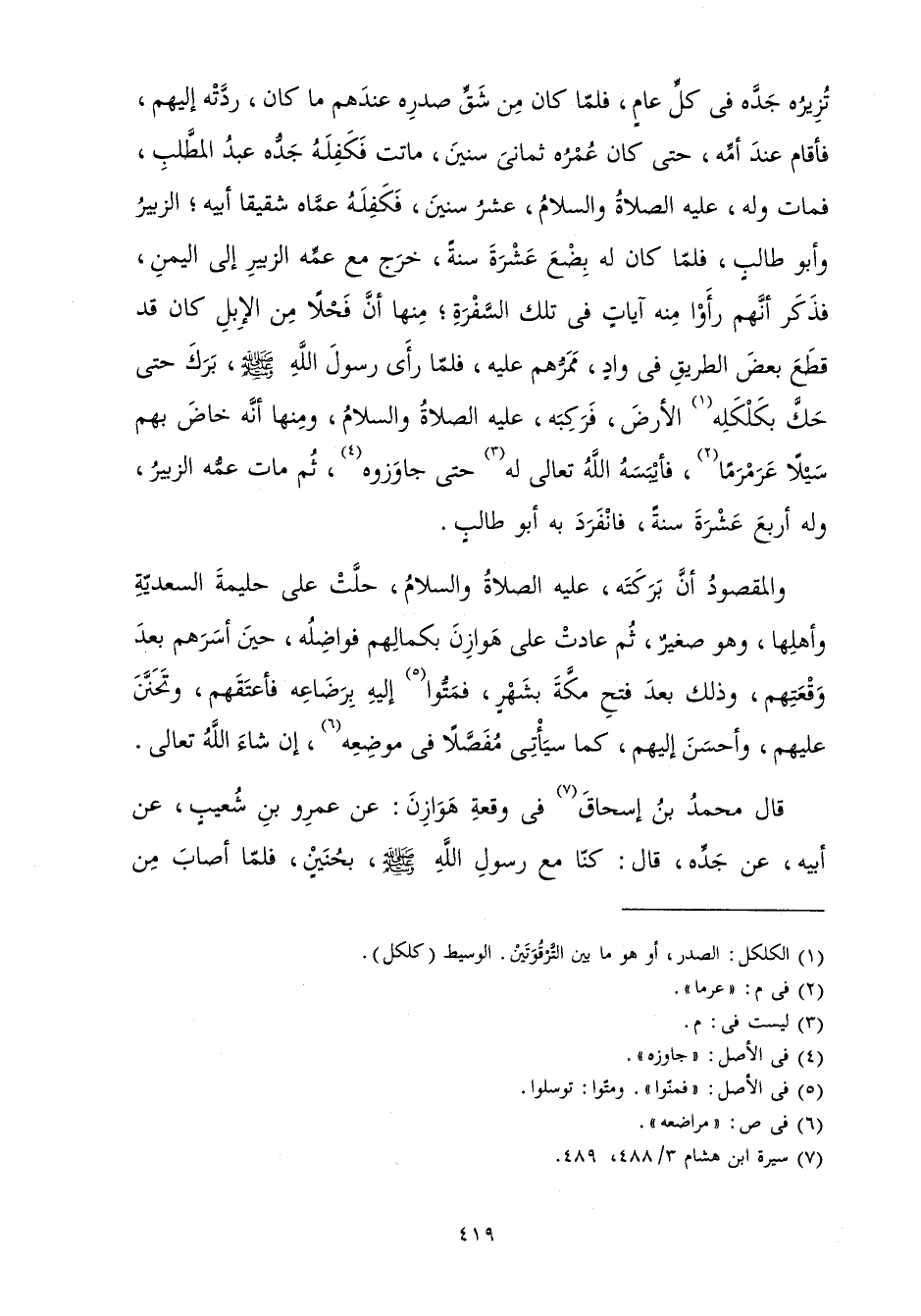 وَالْمَقْصُودُ أَنَّ بَرَكَتَهُ عَلَيْهِ الصَّلَاةُ وَالسَّلَامُ حَلَّتْ عَلَى حَلِيمَةَ السَّعْدِيَّةِ وَأَهْلِهَا وَهُوَ صَغِيرٌ، ثُمَّ عَادَتْ عَلَى هَوَازِنَ بِكَمَالِهِمْ فَوَاضِلُهُ حِينَ أَسَرَهُمْ بَعْدَ وَقْعَتِهِمْ وَذَلِكَ بَعْدَ فَتْحِ مَكَّةَ بِشَهْرٍ فَمَتُّوا إِلَيْهِ بِرَضَاعِهِ فَأَعْتَقَهُمْ، وَتَحَنَنَّ عَلَيْهِمْ، وَأَحْسَنَ إِلَيْهِمْ، كَمَا سَيَأْتِي مُفُصَّلًا فِي مَوْضِعِهِ إِنْ شَاءَ اللَّهُ تَعَالَى.