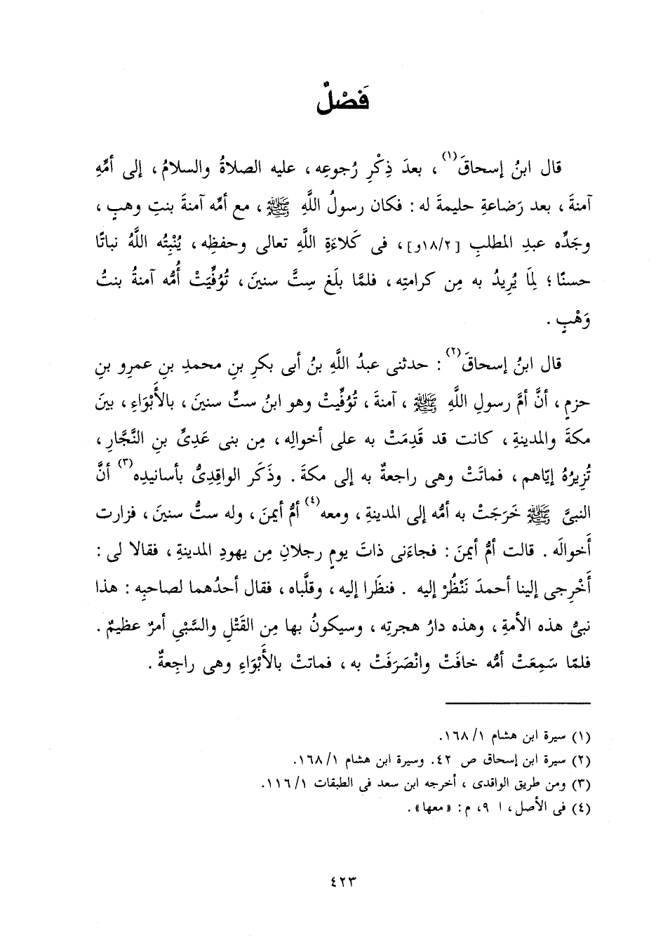 قَالَ ابْنُ إِسْحَاقَ بَعْدَ ذِكْرِ رُجُوعِهِ عَلَيْهِ الصَّلَاةُ وَالسَّلَامُ، إِلَى أُمِّهِ آمِنَةَ بَعْدَ رَضَاعَةِ حَلِيمَةَ لَهُ: فَكَانَ رَسُولُ اللَّهِ صَلَّى اللَّهُ عَلَيْهِ وَسَلَّمَ، مَعَ أُمِّهِ آمِنَةَ بِنْتِ وَهْبٍ وَجَدِّهِ عَبْدِ الْمُطَّلِبِ فِي كَلَاءَةِ اللَّهِ وَحِفْظِهِ، يُنْبِتُهُ اللَّهُ نَبَاتًا حَسَنًا لِمَا يُرِيدُ بِهِ مِنْ كَرَامَتِهِ فَلَمَّا بَلَغَ سِتَّ سِنِينَ تُوُفِّيَتْ أُمُّهُ آمِنَةُ بِنْتُ وَهْبٍ.