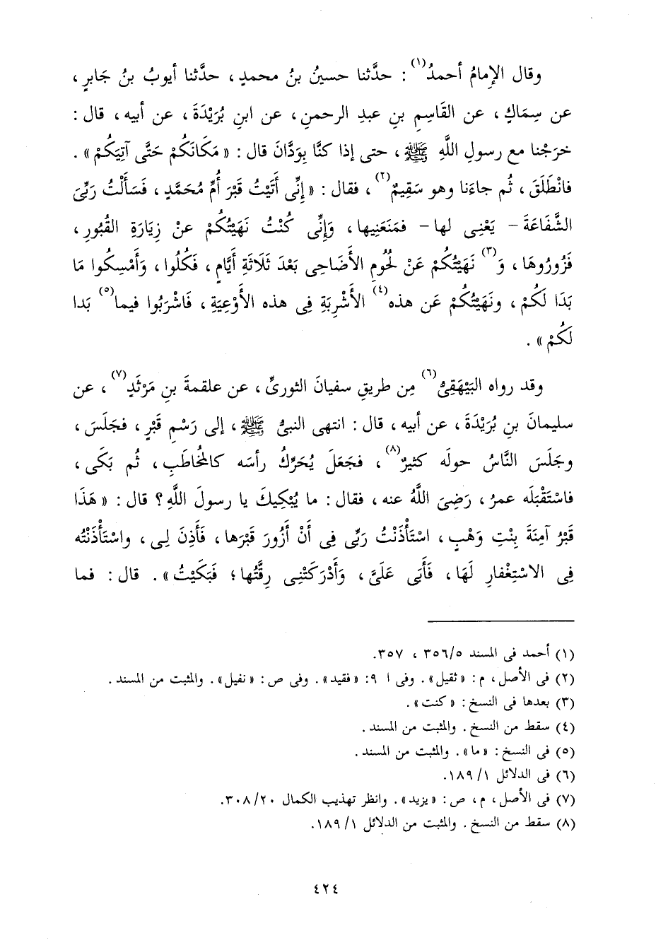 وَقَدْ رَوَاهُ الْبَيْهَقِيُّ مِنْ طَرِيقِ سُفْيَانَ الثَّوْرِيِّ عَنْ عَلْقَمَةَ بْنِ مَرْثَدٍ عَنْ سُلَيْمَانَ بْنِ بُرَيْدَةَ عَنْ أَبِيهِ قَالَ «انْتَهَى النَّبِيُّ صَلَّى اللَّهُ عَلَيْهِ وَسَلَّمَ إِلَى رَسْمِ قَبْرٍ فَجَلَسَ وَجَلَسَ النَّاسُ حَوْلَهُ كَثِيرٌ فَجَعَلَ يُحَرِّكُ رَأْسَهُ كَالْمُخَاطِبِ ثُمَّ بَكَى فَاسْتَقْبَلَهُ عُمَرُ رَضِيَ اللَّهُ عَنْهُ فَقَالَ: مَا يُبْكِيكَ يَا رَسُولَ اللَّهِ؟ قَالَ: هَذَا قَبْرُ آمِنَةَ بِنْتِ وَهْبٍ اسْتَأْذَنْتُ رَبِّي فِي أَنْ أَزُورَ قَبْرَهَا فَأَذِنَ لِي، وَاسْتَأْذَنْتُهُ فِي الِاسْتِغْفَارِ لَهَا فَأَبَى عَلَيَّ، وَأَدْرَكَتْنِي رِقَّتُهَا فَبَكَيْتُ قَالَ: فَمَا