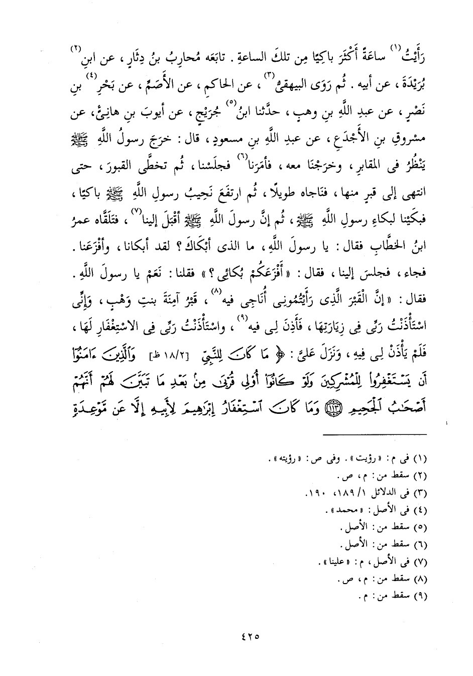 رَأَيْتُ سَاعَةً أَكْثَرَ بَاكِيًا مِنْ تِلْكَ السَّاعَةِ» . تَابَعَهُ مُحَارِبُ بْنُ دِثَارٍ عَنْ بُرَيْدَةَ عَنْ أَبِيهِ، ثُمَّ رَوَى الْبَيْهَقِيُّ عَنِ الْحَاكِمِ عَنِ الْأَصَمِّ عَنْ بَحْرِ بْنِ نَصْرٍ عَنْ عَبْدِ اللَّهِ بْنِ وَهْبٍ حَدَّثَنَا ابْنُ جُرَيْجٍ عَنْ أَيُّوبَ بْنِ هَانِئٍ عَنْ مَسْرُوقِ بْنِ الْأَجْدَعِ عَنْ عَبْدِ اللَّهِ بْنِ مَسْعُودٍ قَالَ «خَرَجَ رَسُولُ اللَّهِ صَلَّى اللَّهُ عَلَيْهِ وَسَلَّمَ يَنْظُرُ فِي الْمَقَابِرِ وَخَرَجْنَا مَعَهُ فَأَمَرَنَا فَجَلَسْنَا، ثُمَّ تَخَطَّى الْقُبُورَ حَتَّى انْتَهَى إِلَى قَبْرٍ مِنْهَا فَنَاجَاهُ طَوِيلًا، ثُمَّ ارْتَفَعَ نَحِيبُ رَسُولِ اللَّهِ صَلَّى اللَّهُ عَلَيْهِ وَسَلَّمَ بَاكِيًا فَبَكَيْنَا لِبُكَاءِ رَسُولِ اللَّهِ صَلَّى اللَّهُ عَلَيْهِ وَسَلَّمَ ثُمَّ إِنَّ رَسُولَ اللَّهِ صَلَّى اللَّهُ عَلَيْهِ وَسَلَّمَ أَقْبَلَ عَلَيْنَا فَتَلَقَّاهُ عُمَرُ بْنُ الْخَطَّابِ فَقَالَ: يَا رَسُولَ اللَّهِ مَا الَّذِي أَبْكَاكَ؟ لَقَدْ أَبْكَانَا وَأَفْزَعَنَا فَجَاءَ فَجَلَسَ إِلَيْنَا فَقَالَ: أَفْزَعَكُمْ بُكَائِي؟ قُلْنَا: نَعَمْ قَالَ: إِنَّ الْقَبْرَ الَّذِي رَأَيْتُمُونِي أُنَاجِي قَبْرَ آمِنَةَ بِنْتِ وَهْبٍ، وَإِنِّي اسْتَأْذَنْتُ رَبِّي فِي زِيَارَتِهَا فَأَذِنَ لِي، وَاسْتَأْذَنْتُ رَبِّي فِي الِاسْتِغْفَارِ لَهَا فَلَمْ يَأْذَنْ لِي فِيهِ، وَنَزَلَ عَلَيَّ " {مَا كَانَ لِلنَّبِيِّ وَالَّذِينَ آمَنُوا أَنْ يَسْتَغْفِرُوا لِلْمُشْرِكِينَ وَلَوْ كَانُوا أُولِي قُرْبَى مِنْ بَعْدِ مَا تَبَيَّنَ لَهُمْ أَنَّهُمْ أَصْحَابُ الْجَحِيمِ وَمَا كَانَ اسْتِغْفَارُ إِبْرَاهِيمَ لِأَبِيهِ إِلَّا عَنْ مَوْعِدَةٍ