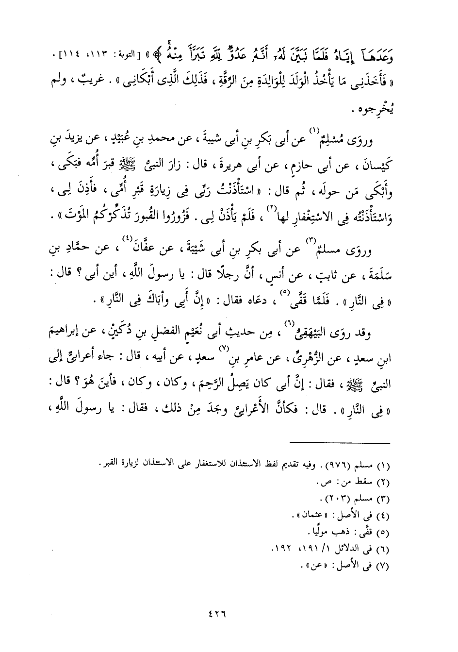 وَرَوَى مُسْلِمٌ عَنْ أَبِي بَكْرِ بْنِ أَبِي شَيْبَةَ عَنْ مُحَمَّدِ بْنِ عُبَيْدٍ عَنْ يَزِيدَ بْنِ كَيْسَانَ عَنْ أَبِي حَازِمٍ عَنْ أَبِي هُرَيْرَةَ قَالَ «زَارَ النَّبِيُّ صَلَّى اللَّهُ عَلَيْهِ وَسَلَّمَ قَبْرَ أُمِّهِ فَبَكَى وَأَبْكَى مَنْ حَوْلَهُ، ثُمَّ قَالَ: اسْتَأْذَنْتُ رَبِّي فِي زِيَارَةِ قَبْرِ أُمِّي فَأَذِنَ لِي، وَاسْتَأْذَنْتُهُ فِي الِاسْتِغْفَارِ لَهَا فَلَمْ يَأْذَنْ لِي فَزُورُوا الْقُبُورَ تُذَكِّرُكُمُ الْمَوْتَ» وَرَوَى مُسْلِمٌ عَنْ أَبِي بَكْرِ بْنِ أَبِي شَيْبَةَ عَنْ عَفَّانَ عَنْ حَمَّادِ بْنِ سَلَمَةَ عَنْ ثَابِتٍ عَنْ أَنَسٍ أَنَّ رَجُلًا قَالَ: «يَا رَسُولَ اللَّهِ أَيْنَ أَبِي؟ قَالَ: فِي النَّارِ فَلَمَّا قَفَّى دَعَاهُ فَقَالَ: إِنَّ أَبِي وَأَبَاكَ فِي النَّارِ» .