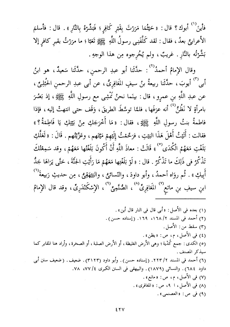 فَأَيْنَ أَبُوكَ؟ قَالَ: حَيْثُمَا مَرَرْتَ بِقَبْرِ كَافِرٍ فَبَشِّرْهُ بِالنَّارِ قَالَ: فَأَسْلَمَ الْأَعْرَابِيُّ بَعْدُ فَقَالَ: لَقَدْ كَلَّفَنِي رَسُولُ اللَّهِ صَلَّى اللَّهُ عَلَيْهِ وَسَلَّمَ تَعَبًا، مَا مَرَرْتُ بِقَبْرِ كَافِرٍ إِلَّا بَشَّرْتُهُ بِالنَّارِ» غَرِيبٌ، وَلَمْ يُخْرِجُوهُ مِنْ هَذَا الْوَجْهِ.