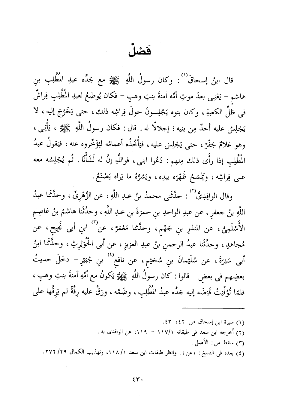 وَقَالَ الْوَاقِدِيُّ حَدَّثَنِي مُحَمَّدُ بْنُ عَبْدِ اللَّهِ عَنِ الزُّهْرِيِّ، وَحَدَّثَنَا عَبْدُ اللَّهِ بْنُ جَعْفَرٍ عَنْ عَبْدِ الْوَاحِدِ بْنِ حَمْزَةَ بْنِ عَبْدِ اللَّهِ، وَحَدَّثَنَا هَاشِمُ بْنُ عَاصِمٍ الْأَسْلَمِيُّ عَنِ الْمُنْذِرِ بْنِ جَهْمٍ، وَحَدَّثَنَا مَعْمَرٌ عَنِ ابْنِ أَبِي نَجِيحٍ عَنْ مُجَاهِدٍ، وَحَدَّثَنَا عَبْدُ الرَّحْمَنِ بْنُ عَبْدِ الْعَزِيزِ عَنْ أَبِي الْحُوَيْرِثِ، وَحَدَّثَنَا ابْنُ أَبِي سَبْرَةَ عَنْ سُلَيْمَانَ بْنِ سُحَيْمٍ عَنْ نَافِعِ بْنِ جُبَيْرٍ - دَخَلَ حَدِيثُ بَعْضِهِمْ فِي بَعْضٍ - قَالُوا: كَانَ رَسُولُ اللَّهِ صَلَّى اللَّهُ عَلَيْهِ وَسَلَّمَ يَكُونُ مَعَ أُمِّهِ آمِنَةَ بِنْتِ وَهْبٍ فَلَمَّا تُوُفِّيَتْ قَبَضَهُ إِلَيْهِ جَدُّهُ عَبْدُ الْمُطَّلِبِ وَضَمَّهُ وَرَقَّ عَلَيْهِ رِقَّةً لَمْ يَرِقَّهَا عَلَى