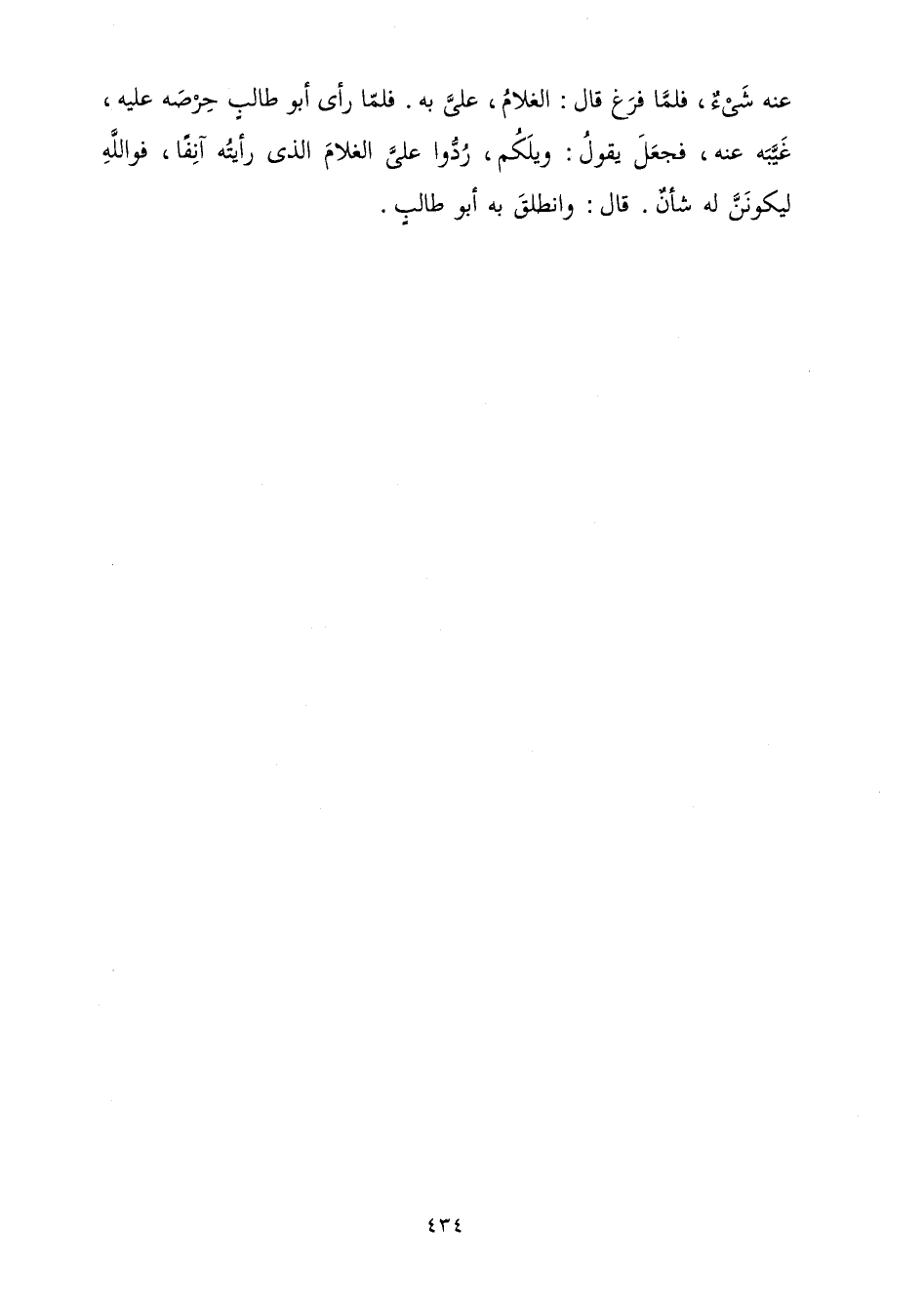 عَنْهُ شَيْءٌ فَلَمَّا فَرَغَ قَالَ: الْغُلَامُ عَلِيَّ بِهِ فَلَمَّا رَأَى أَبُو طَالِبٍ حِرْصَهُ عَلَيْهِ غَيَّبَهُ عَنْهُ فَجَعَلَ يَقُولُ: وَيَلَكُمْ رُدُّوا عَلَيَّ الْغُلَامَ الَّذِي رَأَيْتُهُ آنِفًا فَوَاللَّهِ لَيَكُونَنَّ لَهُ شَأْنٌ قَالَ: وَانْطَلَقَ بِهِ أَبُو طَالِبٍ.