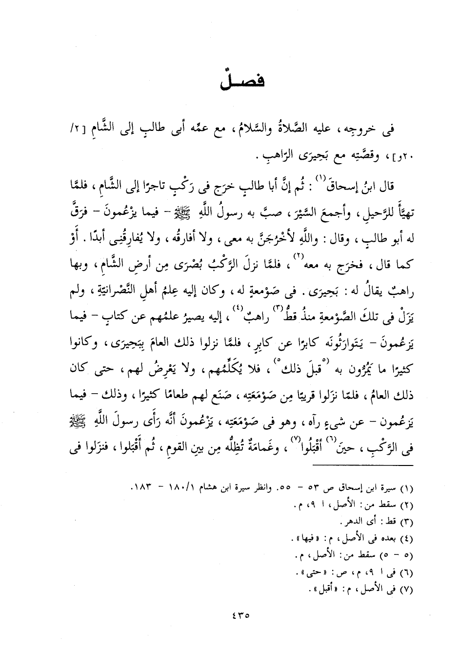 قَالَ ابْنُ إِسْحَاقَ: ثُمَّ إِنَّ أَبَا طَالِبٍ خَرَجَ فِي رَكْبٍ تَاجِرًا إِلَى الشَّامِ فَلَمَّا تَهَيَّأَ لِلرَّحِيلِ، وَأَجْمَعَ السَّيْرَ صَبَّ بِهِ رَسُولُ اللَّهِ صَلَّى اللَّهُ عَلَيْهِ وَسَلَّمَ - فِيمَا يَزْعُمُونَ - فَرَقَّ لَهُ أَبُو طَالِبٍ، وَقَالَ: وَاللَّهُ لَأَخْرُجَنَّ بِهِ مَعِي وَلَا أُفَارِقُهُ وَلَا يُفَارِقُنِي أَبَدًا، أَوْ كَمَا قَالَ فَخَرَجَ بِهِ فَلَمَّا نَزَلَ الرَّكْبُ بُصْرَى مِنْ أَرْضِ الشَّامِ، وَبِهَا رَاهِبٌ يُقَالَ لَهُ: بَحِيرَى فِي صَوْمَعَةٍ لَهُ وَكَانَ إِلَيْهِ عِلْمُ أَهْلِ النَّصْرَانِيَّةِ، وَلَمْ يَزَلْ فِي تِلْكَ الصَّوْمَعَةِ مُنْذُ قَطُّ رَاهِبٌ فِيهَا إِلَيْهِ يَصِيرُ عِلْمُهُمْ عَنْ كِتَابٍ - فِيمَا يَزْعُمُونَ - يَتَوَارَثُونَهُ كَابِرًا عَنْ كَابِرٍ فَلَمَّا نَزَلُوا ذَلِكَ الْعَامَ بِبَحِيرَى كَانُوا كَثِيرًا مَا يَمُرُّونَ بِهِ قَبْلَ ذَلِكَ فَلَا يُكَلِّمُهُمْ وَلَا يَعْرِضُ لَهُمْ حَتَّى كَانَ ذَلِكَ الْعَامُ فَلَمَّا نَزَلُوا قَرِيبًا مِنْ صَوْمَعَتِهِ صَنَعَ لَهُمْ طَعَامًا كَثِيرًا، وَذَلِكَ - فِيمَا يَزْعُمُونَ - عَنْ شَيْءٍ رَآهُ وَهُوَ فِي صَوْمَعَتِهِ يَزْعُمُونَ أَنَّهُ رَأَى رَسُولَ اللَّهِ صَلَّى اللَّهُ عَلَيْهِ وَسَلَّمَ فِي الرَّكْبِ حِينَ أَقْبَلُوا، وَغَمَامَةٌ تُظِلُّهُ مِنْ بَيْنِ الْقَوْمِ، ثُمَّ أَقْبَلَوا فَنَزَلُوا فِي
