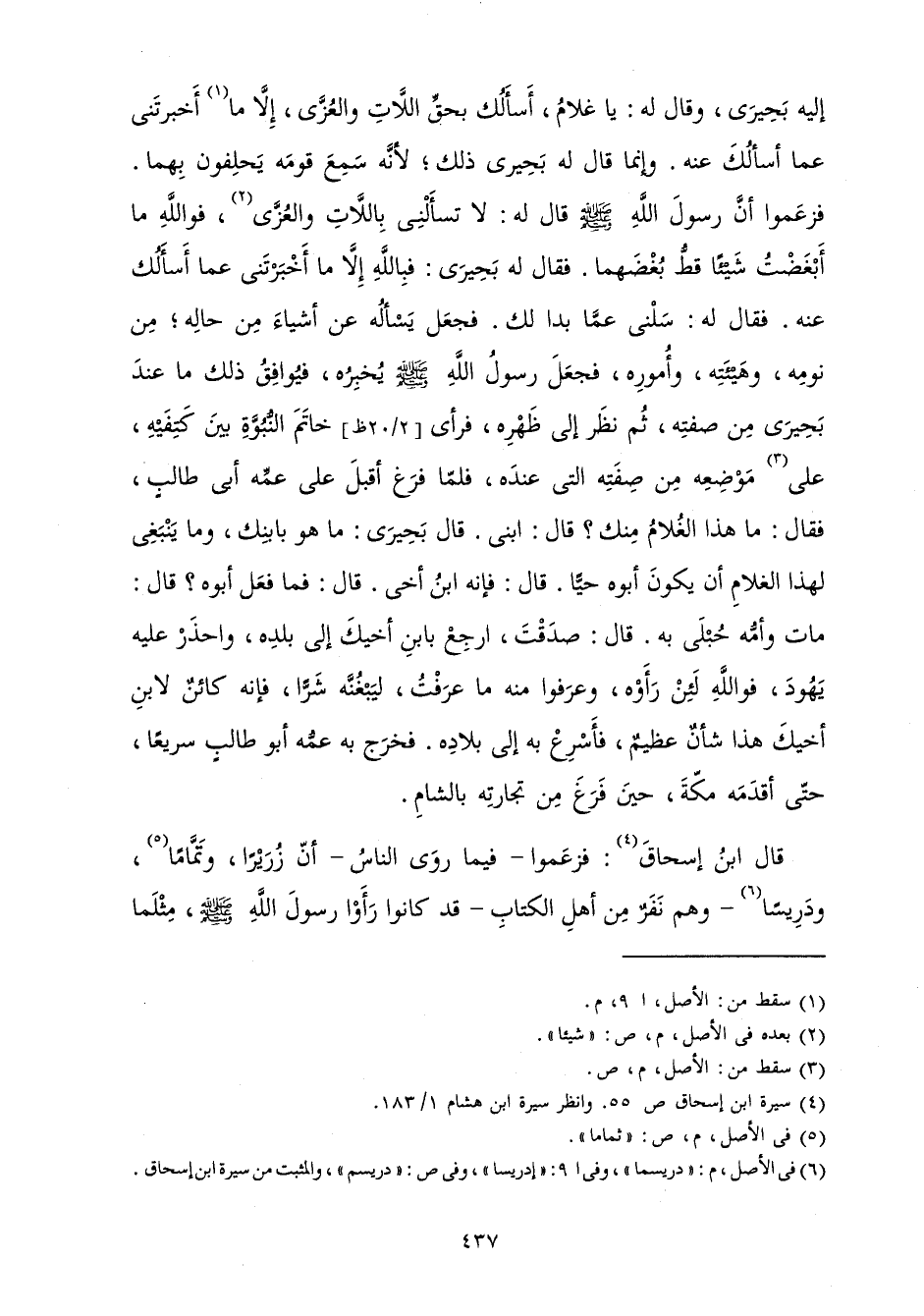 وَقَالَ لَهُ: يَا غُلَامُ أَسْأَلُكَ بِحَقِّ اللَّاتِ وَالْعُزَّى إِلَّا أَخْبَرْتَنِي عَمَّا أَسْأَلُكَ عَنْهُ، وَإِنَّمَا قَالَ لَهُ بَحِيرَى ذَلِكَ; لِأَنَّهُ سَمِعَ قَوْمَهُ يَحْلِفُونَ بِهِمَا فَزَعَمُوا أَنَّ رَسُولَ اللَّهِ صَلَّى اللَّهُ عَلَيْهِ وَسَلَّمَ قَالَ: لَهُ: لَا تَسْأَلْنِي بِاللَّاتِ وَالْعُزَّى فَوَاللَّهِ مَا أَبْغَضْتُ شَيْئًا قَطُّ بُغْضَهُمَا فَقَالَ لَهُ بَحِيرَى: فَبِاللَّهِ إِلَّا مَا أَخْبَرْتَنِي عَمَّا أَسْأَلُكَ عَنْهُ فَقَالَ لَهُ: سَلْنِي عَمَّا بَدَا لَكَ فَجَعَلَ يَسْأَلُهُ عَنْ أَشْيَاءَ مِنْ حَالِهِ مِنْ نَوْمِهِ وَهَيْئَتِهِ وَأُمُورِهِ فَجَعَلَ رَسُولُ اللَّهِ صَلَّى اللَّهُ عَلَيْهِ وَسَلَّمَ يُخْبِرُهُ فَوَافَقَ ذَلِكَ مَا عِنْدَ بَحِيرَى مَنْ صِفَتِهِ، ثُمَّ نَظَرَ إِلَى ظَهْرِهِ فَرَأَى خَاتَمَ النُّبُوَّةِ بَيْنَ كَتِفَيْهِ عَلَى مَوْضِعِهِ مَنْ صِفَتِهِ الَّتِي عِنْدَهُ فَلَمَّا فَرَغَ أَقْبَلَ عَلَى عَمِّهِ أَبِي طَالِبٍ فَقَالَ: مَا هَذَا الْغُلَامُ مِنْكَ؟ قَالَ: ابْنِي قَالَ بَحِيرَى: مَا هُوَ بِابْنِكَ وَمَا يَنْبَغِي لِهَذَا الْغُلَامِ أَنْ يَكُونَ أَبُوهُ حَيًّا قَالَ: فَإِنَّهُ ابْنُ أَخِي قَالَ: فَمَا فَعَلَ أَبُوهُ؟ قَالَ: مَاتَ وَأَمُّهُ حُبْلَى بِهِ. قَالَ: صَدَقْتَ ارْجِعْ بِابْنِ أَخِيكَ إِلَى بَلَدِهِ، وَاحْذَرْ عَلَيْهِ يَهُودَ فَوَاللَّهِ لَئِنْ رَأَوْهُ وَعَرَفُوا مِنْهُ مَا عَرَفْتُ، لِيَبْغُنَّهُ شَرًّا فَإِنَّهُ كَائِنٌ لِابْنِ أَخِيكَ هَذَا شَأْنٌ عَظِيمٌ فَأَسْرِعْ بِهِ إِلَى بِلَادِهِ فَخَرَجَ بِهِ عَمُّهُ أَبُو طَالِبٍ سَرِيعًا حَتَّى أَقْدَمَهُ مَكَّةَ حِينَ فَرَغَ مِنْ تِجَارَتِهِ بِالشَّامِ.