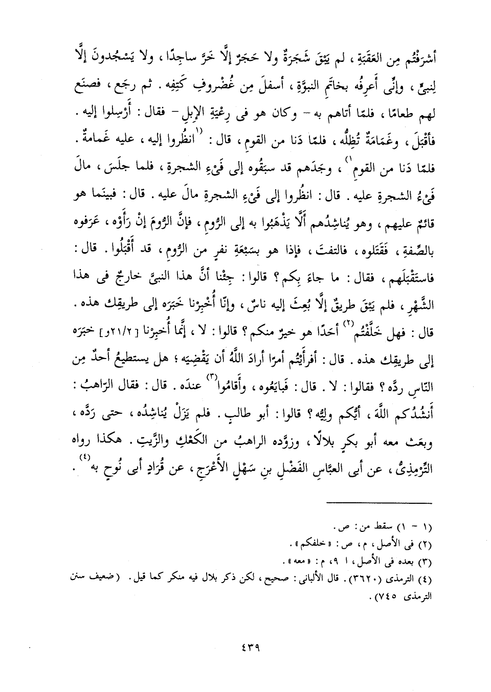 فَلَمَّا أَتَاهُمْ بِهِ - وَكَانَ هُوَ فِي رَعْيَةِ الْإِبِلِ - فَقَالَ: أَرْسِلُوا إِلَيْهِ فَأَقْبَلَ، وَغَمَامَةٌ تُظِلُّهُ فَلَمَّا دَنَا مِنَ الْقَوْمِ قَالَ: انْظُرُوا إِلَيْهِ عَلَيْهِ غَمَامَةٌ فَلَمَّا دَنَا مِنَ الْقَوْمِ وَجَدَهُمْ قَدْ سَبَقُوهُ إِلَى فَيْءِ الشَّجَرَةِ فَلَمَّا جَلَسَ مَالَ فَيْءُ الشَّجَرَةِ عَلَيْهِ قَالَ: انْظُرُوا إِلَى فَيْءِ الشَّجَرَةِ مَالَ عَلَيْهِ قَالَ: فَبَيْنَمَا هُوَ قَائِمٌ عَلَيْهِمْ وَهُوَ يُنَاشِدُهُمْ أَلَّا يَذْهَبُوا بِهِ إِلَى الرُّومِ فَإِنَّ الرُّومَ إِنْ رَأَوْهُ عَرَفُوهُ بِالصِّفَةِ فَقَتَلُوهُ فَالْتَفَتَ فَإِذَا هُوَ بِسَبْعَةِ نَفَرٍ مِنَ الرُّومِ قَدْ أَقْبَلُوا قَالَ: فَاسْتَقْبَلَهُمْ فَقَالَ: مَا جَاءَ بِكُمْ؟ قَالُوا: جِئْنَا أَنَّ هَذَا النَّبِيَّ خَارِجٌ فِي هَذَا الشَّهْرِ فَلَمْ يَبْقَ طَرِيقٌ إِلَّا بُعِثَ إِلَيْهِ نَاسٌ، وَإِنَّا أُخْبِرْنَا خَبَرَهُ إِلَى طَرِيقِكَ هَذِهِ قَالَ: فَهَلْ خَلَّفْتُمْ أَحَدًا هُوَ خَيْرٌ مِنْكُمْ؟ قَالُوا: لَا إِنَّمَا أُخْبِرْنَا خَبَرَهُ إِلَى طَرِيقِكَ هَذِهِ قَالَ: أَفَرَأَيْتُمْ أَمْرًا أَرَادَ اللَّهُ أَنْ يَقْضِيَهُ هَلْ يَسْتَطِيعُ أَحَدٌ مِنَ النَّاسِ رَدَّهُ؟ فَقَالُوا: لَا قَالَ: فَبَايَعُوهُ، وَأَقَامُوا مَعَهُ عِنْدَهُ قَالَ: فَقَالَ الرَّاهِبُ: أَنْشُدُكُمُ اللَّهَ أَيُّكُمْ وَلِيُّهُ قَالُوا: أَبُو طَالِبٍ فَلَمْ يَزَلْ يُنَاشِدُهُ حَتَّى رَدَّهُ، وَبَعَثَ مَعَهُ أَبُو بَكْرٍ بِلَالًا، وَزَوَّدَهُ الرَّاهِبُ مِنَ الْكَعْكِ وَالزَّيْتِ.