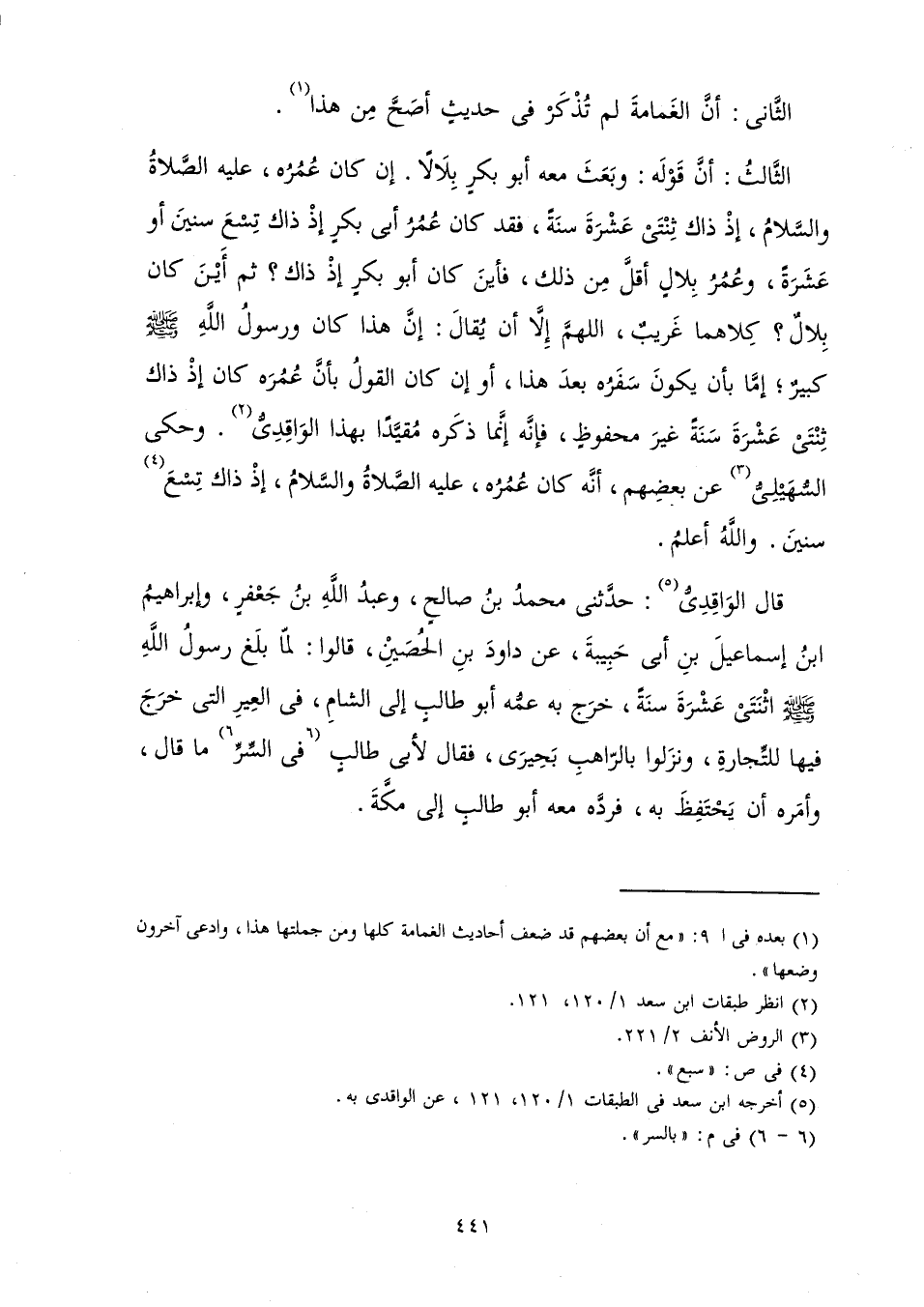 الثَّالِثُ: أَنَّ قَوْلَهُ، وَبَعْثَ مَعَهُ أَبُو بَكْرٍ بِلَالًا إِنْ كَانَ عُمُرُهُ عَلَيْهِ الصَّلَاةُ وَالسَّلَامُ إِذْ ذَاكَ ثِنْتَيْ عَشْرَةَ سَنَةً فَقَدْ كَانَ عُمُرُ أَبِي بَكْرٍ إِذْ ذَاكَ تِسْعَ سِنِينَ أَوْ عَشْرَةَ، وَعُمُرُ بِلَالٍ أَقَلَّ مِنْ ذَلِكَ فَأَيْنَ كَانَ أَبُو بَكْرٍ إِذْ ذَاكَ؟ ثُمَّ أَيْنَ كَانَ بِلَالٌ؟ كِلَاهُمَا غَرِيبٌ اللَّهُمَّ إِلَّا أَنْ يُقَالَ: إِنَّ هَذَا كَانَ، وَرَسُولُ اللَّهِ صَلَّى اللَّهُ عَلَيْهِ وَسَلَّمَ كَبِيرٌ، إِمَّا بِأَنْ يَكُونَ سَفَرُهُ بَعْدَ هَذَا أَوْ إِنْ كَانَ الْقَوْلُ بِأَنَّ عُمُرَهُ كَانَ إِذْ ذَاكَ ثِنْتَيْ عَشْرَةَ سَنَةً غَيْرَ مَحْفُوظٍ فَإِنَّهُ إِنَّمَا ذَكَرَهُ مُقَيَّدًا بِهَذَا الْوَاقِدِيُّ، وَحَكَى السُّهَيْلِيُّ عَنْ بَعْضِهِمْ، أَنَّهُ كَانَ عُمُرُهُ عَلَيْهِ الصَّلَاةُ وَالسَّلَامُ إِذْ ذَاكَ تِسْعَ سِنِينَ. وَاللَّهُ أَعْلَمُ.