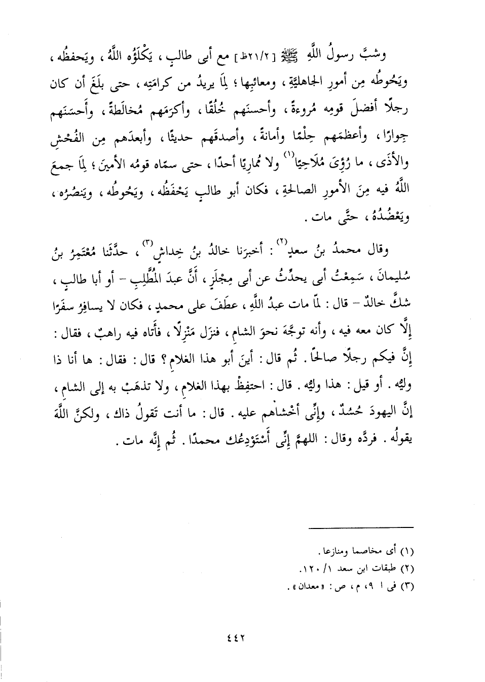 وَقَالَ مُحَمَّدُ بْنُ سَعْدٍ: أَخْبَرَنَا خَالِدُ بْنُ خِدَاشٍ حَدَّثَنَا مُعْتَمِرُ بْنُ سُلَيْمَانَ سَمِعْتُ أَبِي يُحَدِّثُ عَنْ أَبِي مِجْلَزٍ أَنَّ عَبْدَ الْمُطَّلِبِ - أَوْ أَبَا طَالِبٍ شَكَّ خَالِدٌ - قَالَ: لَمَّا مَاتَ عَبْدُ اللَّهِ عَطَفَ عَلَى مُحَمَّدٍ فَكَانَ لَا يُسَافِرُ سَفَرًا إِلَّا كَانَ مَعَهُ فِيهِ، وَإِنَّهُ تَوَجَّهَ نَحْوَ الشَّامِ فَنَزَلَ مَنْزِلًا فَأَتَاهُ فِيهِ رَاهِبٌ فَقَالَ: إِنَّ فِيكُمْ رَجُلًا صَالِحًا، ثُمَّ قَالَ: أَيْنَ أَبُو هَذَا الْغُلَامِ؟ قَالَ: فَقَالَ: هَا أَنَا ذَا وَلِيُّهُ، أَوْ قِيلَ: هَذَا وَلِيُّهُ قَالَ: احْتَفِظْ بِهَذَا الْغُلَامِ وَلَا تَذْهَبْ بِهِ إِلَى الشَّامِ إِنَّ الْيَهُودَ حُسُدٌ، وَإِنِّي أَخْشَاهُمْ عَلَيْهِ. قَالَ: مَا أَنْتَ تَقُولُ ذَلِكَ، وَلَكِنَّ اللَّهَ يَقُولُهُ فَرَدَّهُ، وَقَالَ: اللَّهُمَّ إِنِّي أَسَتُودِعُكَ مُحَمَّدًا، ثُمَّ إِنَّهُ مَاتَ.