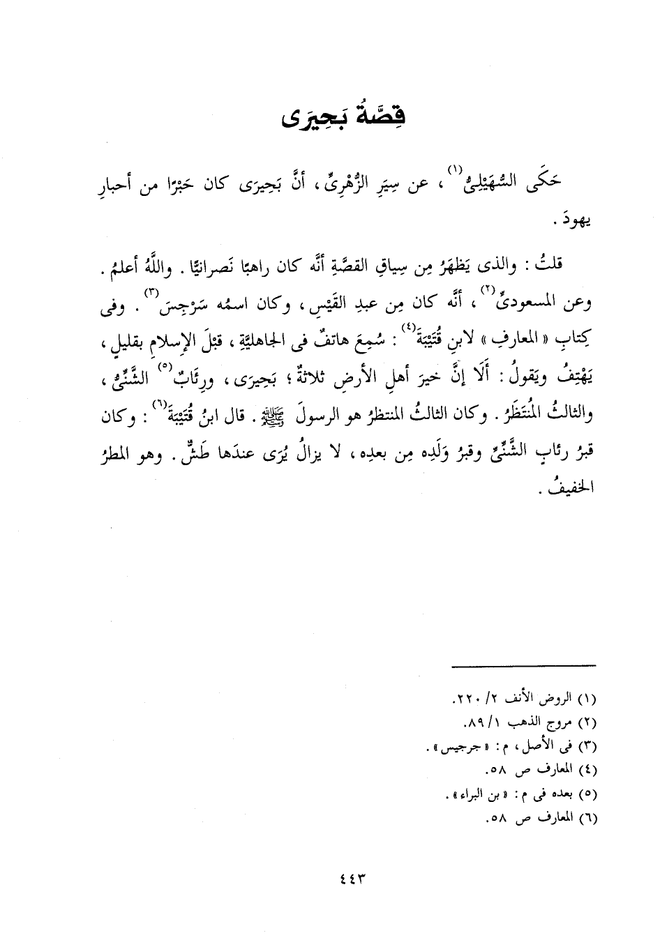 حَكَى السُّهَيْلِيُّ عَنْ سِيَرِ الزُّهْرِيِّ أَنَّ بَحِيرَى كَانَ حَبْرًا مِنْ أَحْبَارِ الْيَهُودِ قُلْتُ: وَالَّذِي يَظْهَرُ مِنْ سِيَاقِ الْقِصَّةِ أَنَّهُ كَانَ رَاهِبًا نَصْرَانِيًّا. وَاللَّهُ أَعْلَمُ. وَعَنِ الْمَسْعُودِيِّ أَنَّهُ كَانَ مَنْ عَبْدِ الْقَيْسِ وَكَانَ اسْمُهُ سَرْجِسَ، وَفِي كِتَابِ الْمَعَارِفِ لِابْنِ قُتَيْبَةَ سُمِعَ هَاتِفٌ فِي الْجَاهِلِيَّةِ قَبْلَ الْإِسْلَامِ بِقَلِيلٍ يَهْتِفُ، وَيَقُولُ: أَلَا إِنَّ خَيْرَ أَهْلِ الْأَرْضِ ثَلَاثَةٌ بَحِيرَى، وَرِئَابٌ الشَّنِّيُّ وَالثَّالِثُ الْمُنْتَظَرُ وَكَانَ الثَّالِثُ الْمُنْتَظَرُ هُوَ الرَّسُولُ صَلَّى اللَّهُ عَلَيْهِ وَسَلَّمَ قَالَ: ابْنُ قُتَيْبَةَ: وَكَانَ قَبْرُ رِئَابٍ الشَّنِّيُّ، وَقَبْرُ وَلَدِهِ مِنْ بَعْدِهِ لَا يَزَالُ يُرَى عِنْدَهَا طَشٌّ وَهُوَ الْمَطَرُ الْخَفِيفُ.