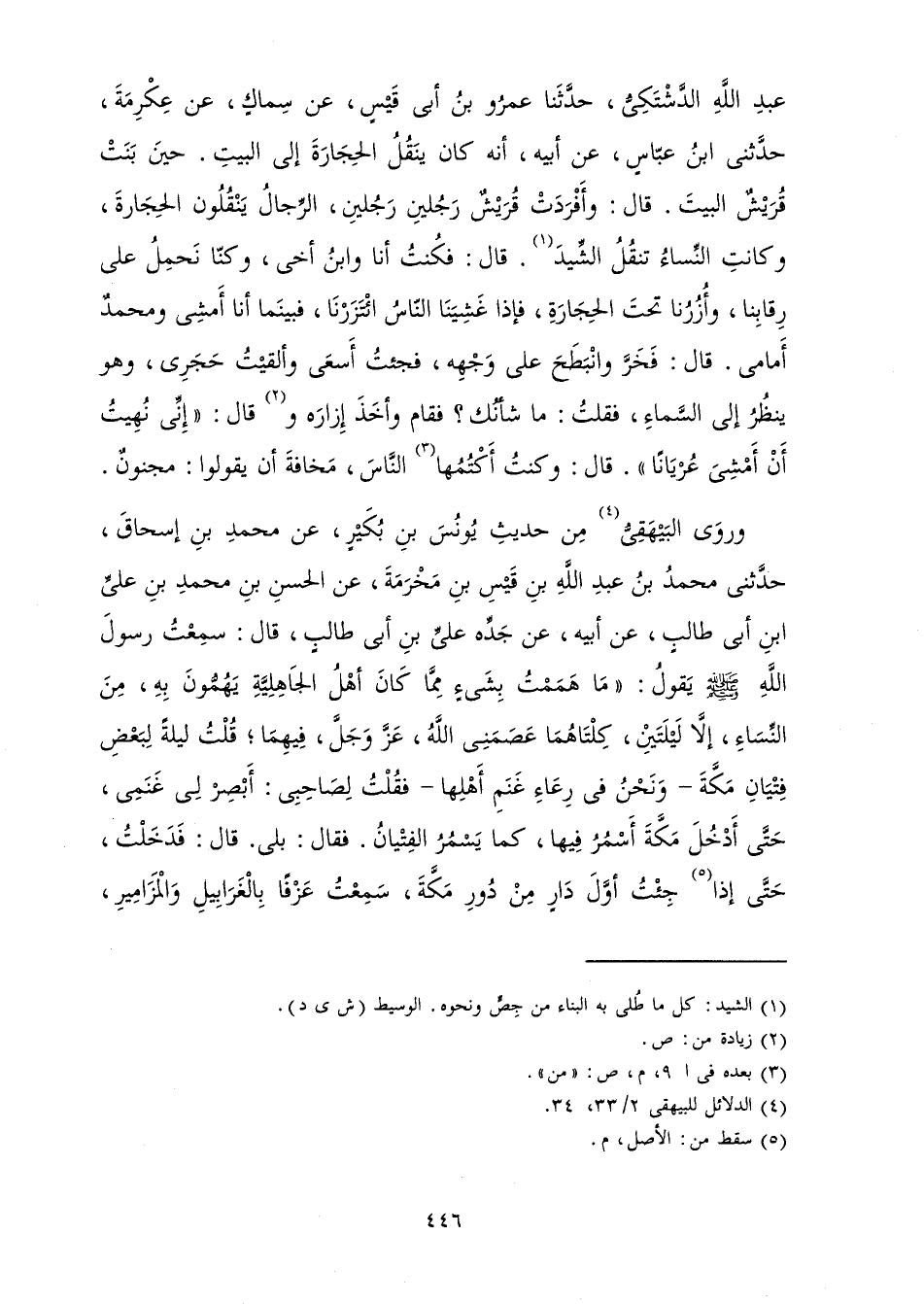 وَرَوَى الْبَيْهَقِيُّ مِنْ حَدِيثِ يُونُسَ بْنِ بُكَيْرٍ عَنْ مُحَمَّدِ بْنِ إِسْحَاقَ حَدَّثَنِي مُحَمَّدُ بْنُ عَبْدِ اللَّهِ بْنِ قَيْسِ بْنِ مَخْرَمَةَ عَنِ الْحَسَنِ بْنِ مُحَمَّدِ بْنِ عَلِيِّ بْنِ أَبِي طَالِبٍ عَنْ أَبِيهِ عَنْ جَدِّهِ عَلِيِّ بْنِ أَبِي طَالِبٍ قَالَ سَمِعْتُ رَسُولَ اللَّهِ صَلَّى اللَّهُ عَلَيْهِ وَسَلَّمَ يَقُولُ: «مَا هَمَمْتُ بِشَيْءٍ مِمَّا كَانَ أَهْلُ الْجَاهِلِيَّةِ يَهُمُّونَ بِهِ مِنَ النِّسَاءِ إِلَّا لَيْلَتَيْنِ كِلْتَاهُمَا عَصَمَنِي اللَّهُ عَزَّ وَجَلَّ فِيهِمَا قُلْتُ لَيْلَةً لِبَعْضِ فِتْيَانِ مَكَّةَ - وَنَحْنُ فِي رِعَاءِ غَنَمِ أَهْلِهَا - فَقُلْتُ لِصَاحِبِي: أَبْصِرْ لِي غَنَمِي حَتَّى أَدْخَلَ مَكَّةَ أَسْمُرُ فِيهَا كَمَا يَسْمُرُ الْفِتْيَانُ فَقَالَ: بَلَى قَالَ: فَدَخَلْتُ حَتَّى جِئْتُ أَوَّلَ دَارٍ مِنْ دُورِ مَكَّةَ سَمِعْتُ عَزْفًا بِالْغَرَابِيلِ وَالْمَزَامِيرِ،