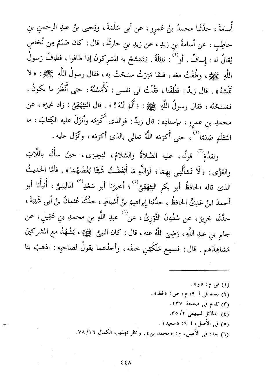 أُسَامَةَ حَدَّثَنَا مُحَمَّدُ بْنُ عَمْرٍو عَنْ أَبِي سَلَمَةَ وَيَحْيَى بْنِ عَبْدِ الرَّحْمَنِ بْنِ حَاطِبٍ عَنْ أُسَامَةَ بْنِ زَيْدٍ عَنْ زَيْدِ بْنِ حَارِثَةَ قَالَ «كَانَ صَنَمٌ مِنْ نُحَاسٍ يُقَالَ لَهُ: إِسَافٌ أَوْ نَائِلَةُ يَتَمَسَّحُ بِهِ الْمُشْرِكُونَ إِذَا طَافُوا فَطَافَ رَسُولُ اللَّهِ صَلَّى اللَّهُ عَلَيْهِ وَسَلَّمَ، وَطَفْتُ مَعَهُ فَلَمَّا مَرَرْتُ مَسَحْتُ بِهِ فَقَالَ رَسُولُ اللَّهِ صَلَّى اللَّهُ عَلَيْهِ وَسَلَّمَ: لَا تَمَسَّهُ قَالَ زَيْدٌ: فَطُفْنَا فَقُلْتُ فِي نَفْسِي: لَأَمَسَّنَّهُ حَتَّى أَنْظُرَ مَا يَكُونُ فَمَسَحْتُهُ فَقَالَ رَسُولُ اللَّهِ صَلَّى اللَّهُ عَلَيْهِ وَسَلَّمَ: أَلَمْ تُنْهَ؟» قَالَ الْبَيْهَقِيُّ زَادَ غَيْرُهُ عَنْ مُحَمَّدِ بْنِ عَمْرٍو بِإِسْنَادِهِ قَالَ زَيْدٌ: فَوَالَّذِي أَكْرَمَهُ، وَأَنْزَلَ عَلَيْهِ الْكِتَابَ مَا اسْتَلَمَ صَنَمًا قَطُّ حَتَّى أَكْرَمَهُ اللَّهُ تَعَالَى بِالَّذِي أَكْرَمَهُ، وَأَنْزَلَ عَلَيْهِ.