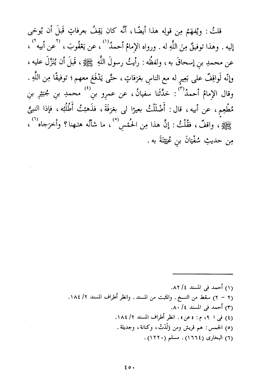 قُلْتُ: وَيُفْهَمُ مِنْ قَوْلِهِ هَذَا أَيْضًا أَنَّهُ كَانَ يَقِفُ بِعَرَفَاتٍ قَبْلَ أَنْ يُوحَى إِلَيْهِ. وَهَذَا تَوْفِيقٌ مِنَ اللَّهِ لَهُ، وَرَوَاهُ الْإِمَامُ أَحْمَدُ عَنْ يَعْقُوبَ عَنْ مُحَمَّدِ بْنِ إِسْحَاقَ بِهِ، وَلَفْظُهُ: رَأَيْتُ رَسُولَ اللَّهِ صَلَّى اللَّهُ عَلَيْهِ وَسَلَّمَ قَبْلَ أَنْ يُنَزَّلَ عَلَيْهِ، وَإِنَّهُ لَوَاقِفٌ عَلَى بَعِيرٍ لَهُ مَعَ النَّاسِ بِعَرَفَاتٍ حَتَّى يَدْفَعَ مَعَهُمْ تَوْفِيقًا مِنَ اللَّهِ وَقَالَ الْإِمَامُ أَحْمَدُ: حَدَّثَنَا سُفْيَانُ عَنْ عَمْرٍو عَنْ مُحَمَّدِ بْنِ جُبَيْرِ بْنِ مُطْعِمٍ عَنْ أَبِيهِ قَالَ: أَضْلَلْتُ بَعِيرًا لِي بِعَرَفَةَ فَذَهَبْتُ أَطْلُبُهُ فَإِذَا النَّبِيُّ صَلَّى اللَّهُ عَلَيْهِ وَسَلَّمَ، وَاقِفٌ فَقُلْتُ: إِنَّ هَذَا مِنَ الْحُمْسِ، مَا شَأْنُهُ هَاهُنَا؟ وَأَخْرَجَاهُ مِنْ حَدِيثِ سُفْيَانَ بْنِ عُيَيْنَةَ بِهِ.