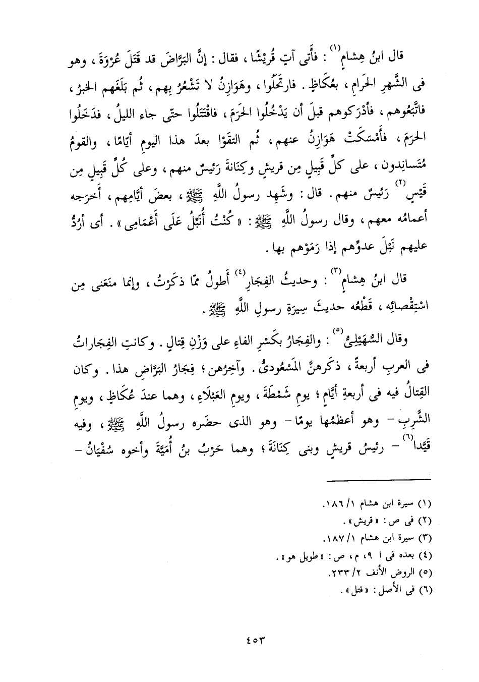 قَالَ ابْنُ هِشَامٍ: وَحَدِيثُ الْفِجَارِ أَطْوَلُ مِمَّا ذَكَرْتُ، وَإِنَّمَا مَنَعَنِي مِنَ اسْتِقْصَائِهِ قَطْعُهُ حَدِيثَ سِيرَةِ رَسُولِ اللَّهِ صَلَّى اللَّهُ عَلَيْهِ وَسَلَّمَ، وَقَالَ السُّهَيْلِيُّ: وَالْفِجَارُ بِكَسْرِ الْفَاءِ عَلَى وَزْنِ قِتَالٍ، وَكَانَتِ الْفِجَارَاتُ فِي الْعَرَبِ أَرْبَعَةً; ذَكَرَهُنَّ الْمَسْعُودِيُّ وَآخِرُهُنَّ فَجِارُ الْبَرَّاضِ هَذَا وَكَانَ الْقِتَالُ فِيهِ فِي أَرْبَعَةِ أَيَّامٍ يَوْمِ شَمْطَةَ وَيَوْمِ الْعَبْلَاءِ وَهُمَا عِنْدَ عُكَاظٍ، وَيَوْمِ الشَّرِبِ - وَهُوَ أَعْظَمُهَا يَوْمًا - وَهُوَ الَّذِي حَضَرَهُ رَسُولُ اللَّهِ صَلَّى اللَّهُ عَلَيْهِ وَسَلَّمَ، وَفِيهِ قَيَّدَا - رَئِيسُ قُرَيْشٍ وَبَنِي كِنَانَةَ، وَهُمَا حَرْبُ بْنُ أُمَيَّةَ وَأَخُوهُ سُفْيَانُ -