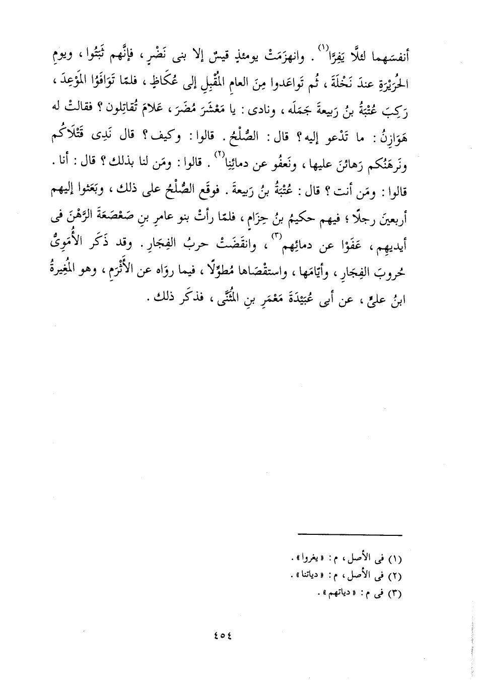 أَنْفُسَهُمَا لِئَلَّا يَفِرَّا، وَانْهَزَمَتْ يَوْمَئِذٍ قَيْسٌ إِلَّا بَنِي نَضْرٍ فَإِنَّهُمْ ثَبَتُوا، وَيَوْمِ الْحُرَيْرَةِ عِنْدَ نَخْلَةَ، ثُمَّ تَوَاعَدُوا مِنَ الْعَامِ الْمُقْبِلِ إِلَى عُكَاظٍ فَلَمَّا تُوَافُوا الْمَوْعِدَ رَكِبَ عُتْبَةُ بْنُ رَبِيعَةَ جَمَلَهُ، وَنَادَى يَا مَعْشَرَ مُضَرَ عَلَامَ تُقَاتِلُونَ؟ فَقَالَتْ لَهُ هَوَازِنُ: مَا تَدْعُو إِلَيْهِ؟ قَالَ: الصُّلْحُ قَالُوا: وَكَيْفَ؟ قَالَ: نَدِيَ قَتْلَاكُمْ، وَنَرْهَنُكُمْ رَهَائِنَ عَلَيْهَا، وَنَعْفُو عَنْ دِمَائِنَا قَالُوا: وَمَنْ لَنَا بِذَلِكَ؟ قَالَ: أَنَا قَالُوا: وَمَنْ أَنْتَ؟ قَالَ عُتْبَةُ بْنُ رَبِيعَةَ فَوَقْعَ الصُّلْحُ عَلَى ذَلِكَ، وَبَعَثُوا إِلَيْهِمْ أَرْبَعِينَ رَجُلًا فِيهِمْ حَكِيمُ بْنُ حِزَامٍ فَلَمَّا رَأَتْ بَنُو عَامِرِ بْنِ صَعْصَعَةَ الرَّهْنَ فِي أَيْدِيهِمْ عَفَوْا عَنْ دِمَائِهِمْ، وَانْقَضَتْ حَرْبُ الْفَجِارِ وَقَدْ ذَكَرَ الْأُمَوِيُّ حُرُوبَ الْفِجَارِ، وَأَيَّامَهَا، وَاسْتَقْصَاهَا مُطَوَّلًا فِيمَا رَوَاهُ عَنِ الْأَثْرَمِ وَهُوَ الْمُغِيرَةُ بْنُ عَلِيٍّ عَنْ أَبِي عُبَيْدَةَ مَعْمَرِ بْنِ الْمُثَنَّى فَذَكَرَ ذَلِكَ.