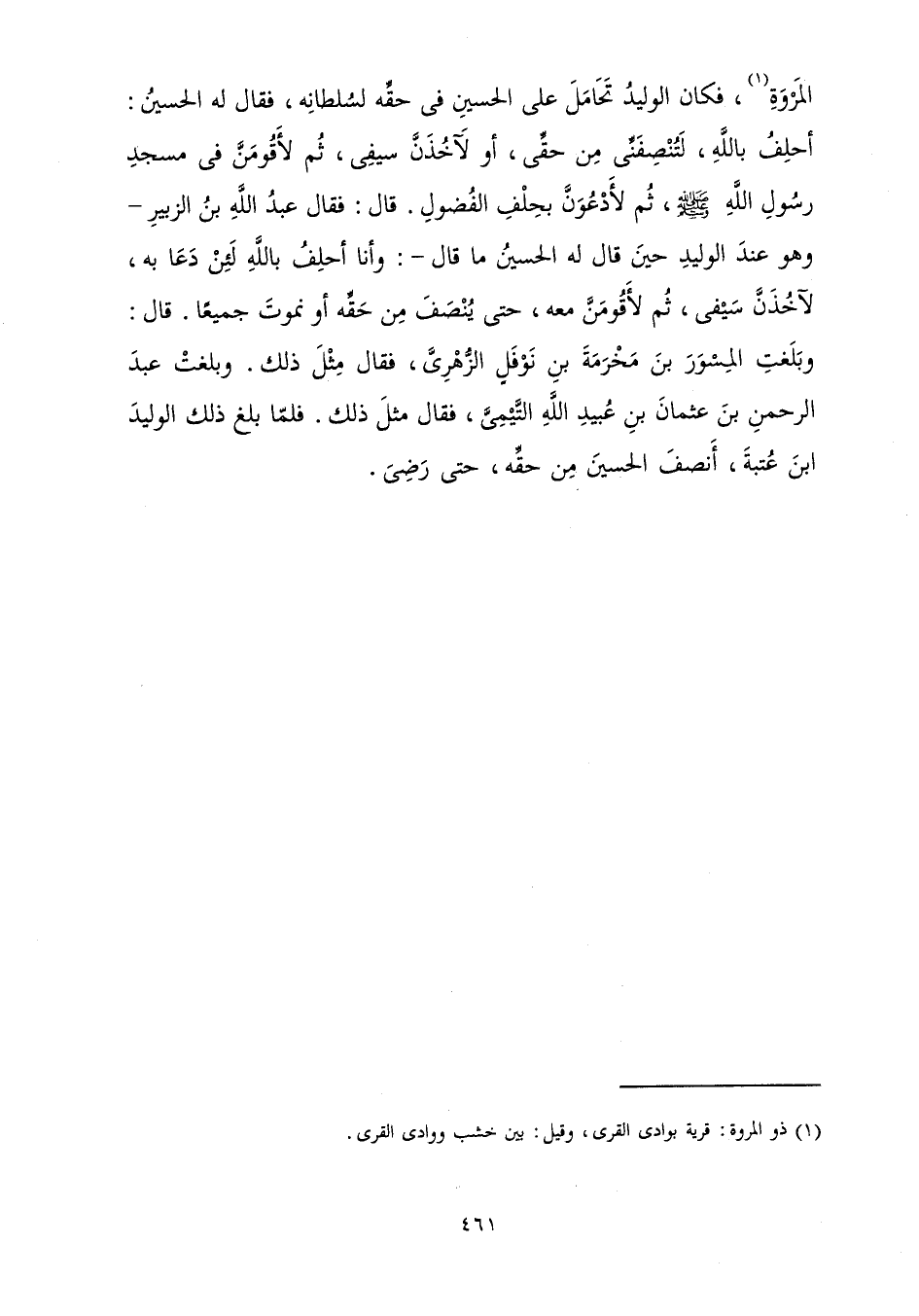 الْمَرْوَةِ فَكَانَ الْوَلِيدُ تَحَامَلَ عَلَى الْحُسَيْنِ فِي حَقِّهِ لِسُلْطَانِهِ فَقَالَ لَهُ الْحُسَيْنُ: أَحْلِفُ بِاللَّهِ لَتُنْصِفَنِّي مِنْ حَقِّي أَوْ لَآخُذَنَّ سَيْفِي، ثُمَّ لَأَقُومَنَّ فِي مَسْجِدِ رَسُولِ اللَّهِ صَلَّى اللَّهُ عَلَيْهِ وَسَلَّمَ، ثُمَّ لَأَدْعُوَنَّ بِحِلْفِ الْفُضُولِ قَالَ: فَقَالَ عَبْدُ اللَّهِ بْنُ الزُّبَيْرِ - وَهُوَ عِنْدَ الْوَلِيدِ حِينَ قَالَ لَهُ الْحُسَيْنُ مَا قَالَ -: وَأَنَا أَحْلِفَ بِاللَّهِ لَئِنْ دَعَا بِهِ لَآخُذُنَّ سَيْفِي، ثُمَّ لَأَقُومَنَّ مَعَهُ حَتَّى يُنْصَفَ مِنْ حَقِّهِ أَوْ نَمُوتَ جَمِيعًا. قَالَ: وَبَلَغَتِ الْمِسْوَرَ بْنَ مَخْرَمَةَ بْنِ نَوْفَلٍ الزُّهْرِيَّ فَقَالَ مِثْلَ ذَلِكَ. وَبَلَغَتْ عَبْدَ الرَّحْمَنِ بْنَ عُثْمَانَ بْنِ عُبَيْدِ اللَّهِ التَّيْمِيَّ فَقَالَ مِثْلَ ذَلِكَ. فَلَمَّا بَلَغَ ذَلِكَ الْوَلِيدَ بْنَ عُتْبَةَ أَنْصَفَ الْحُسَيْنَ مِنْ حَقِّهِ حَتَّى رَضِيَ.