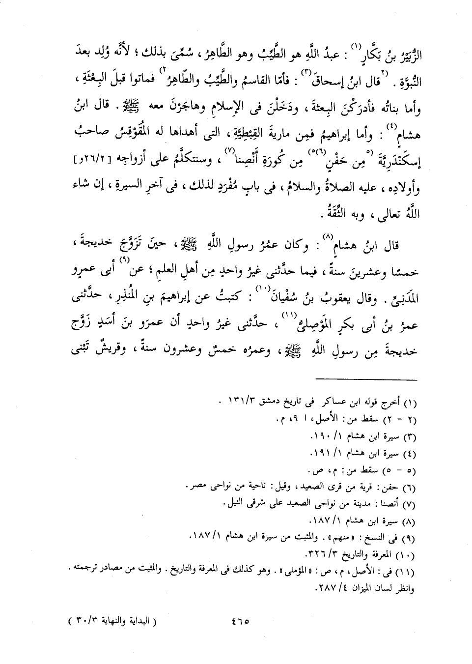 الزُّبَيْرُ بْنُ بَكَّارٍ عَبْدُ اللَّهِ هُوَ الطَّيِّبُ وَهُوَ الطَّاهِرُ سُمِّي بِذَلِكَ لِأَنَّهُ وُلِدَ بَعْدَ النُّبُوَّةِ فَمَاتُوا قَبْلَ الْبِعْثَةِ، وَأَمَّا بَنَاتُهُ فَأَدْرَكْنَ الْبِعْثَةَ وَدَخَلْنَ فِي الْإِسْلَامِ، وَهَاجَرْنَ مَعَهُ صَلَّى اللَّهُ عَلَيْهِ وَسَلَّمَ قَالَ: ابْنُ هِشَامٍ، وَأَمَّا إِبْرَاهِيمُ فَمِنْ مَارِيَةَ الْقِبْطِيَّةِ الَّتِي أَهْدَاهَا لَهُ الْمُقَوْقِسُ صَاحِبُ إِسْكَنْدَرِيَّةَ مِنْ حَفْنٍ مِنْ كُورَةِ أَنْصِنَا، وَسَنَتَكَلَّمُ عَلَى أَزْوَاجِهِ وَأَوْلَادِهِ عَلَيْهِ الصَّلَاةُ وَالسَّلَامُ فِي بَابٍ مُفْرَدٍ لِذَلِكَ فِي آخِرِ السِّيرَةِ إِنْ شَاءَ اللَّهُ تَعَالَى وَبِهِ الثِّقَةُ.