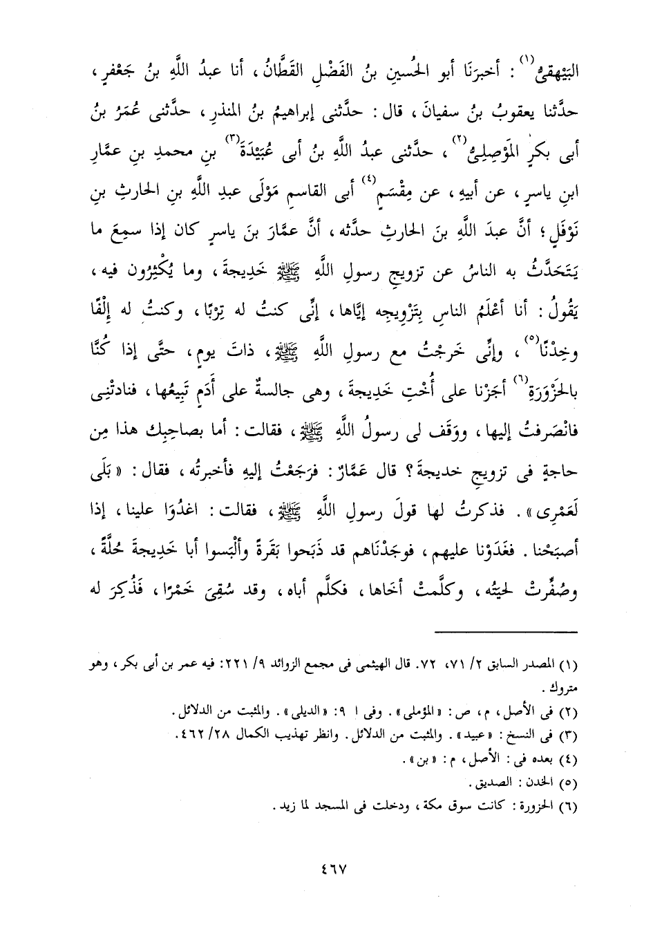 أَخْبَرَنَا أَبُو الْحُسَيْنِ بْنُ الْفَضْلِ الْقَطَّانُ أَنَا عَبْدُ اللَّهِ بْنُ جَعْفَرٍ حَدَّثَنَا يَعْقُوبُ بْنُ سُفْيَانَ قَالَ حَدَّثَنِي إِبْرَاهِيمُ بْنُ الْمُنْذِرِ حَدَّثَنِي عُمَرُ بْنُ أَبِي بَكْرٍ الْمَوْصِلِيُّ حَدَّثَنِي عَبْدُ اللَّهِ بْنُ أَبِي عُبَيْدَةَ بْنِ مُحَمَّدِ بْنِ عَمَّارِ بْنِ يَاسِرٍ عَنْ أَبِيهِ عَنْ مِقْسَمِ بْنِ أَبِي الْقَاسِمِ مَوْلَى عَبْدِ اللَّهِ بْنِ الْحَارِثِ بْنِ نَوْفَلٍ أَنَّ عَبْدَ اللَّهِ بْنَ الْحَارِثِ حَدَّثَهُ أَنَّ عَمَّارَ بْنَ يَاسِرٍ كَانَ إِذَا سَمِعَ مَا يَتَحَدَّثُ بِهِ النَّاسُ عَنْ تَزْوِيجِ رَسُولِ اللَّهِ صَلَّى اللَّهُ عَلَيْهِ وَسَلَّمَ خَدِيجَةَ وَمَا يُكْثِرُونَ فِيهِ يَقُولُ: أَنَا أَعْلَمُ النَّاسِ بِتَزْوِيجِهِ إِيَّاهَا إِنِّي كُنْتُ لَهُ تِرْبًا وَكُنْتُ لَهُ إِلْفًا وَخِدْنًا، وَإِنِّي خَرَجْتُ مَعَ رَسُولِ اللَّهِ صَلَّى اللَّهُ عَلَيْهِ وَسَلَّمَ ذَاتَ يَوْمٍ حَتَّى إِذَا كُنَّا بِالْحَزْوَرَةِ أَجَزْنَا عَلَى أُخْتِ خَدِيجَةَ، وَهِيَ جَالِسَةٌ عَلَى أَدَمٍ تَبِيعُهَا فَنَادَتْنِي فَانْصَرَفْتُ إِلَيْهَا، وَوَقَفَ لِي رَسُولُ اللَّهِ صَلَّى اللَّهُ عَلَيْهِ وَسَلَّمَ فَقَالَتْ: أَمَا بِصَاحِبِكَ هَذَا مِنْ حَاجَةٍ فِي تَزْوِيجِ خَدِيجَةَ؟ قَالَ عَمَّارٌ: فَرَجَعْتُ إِلَيْهِ فَأَخْبَرْتُهُ فَقَالَ: بَلْ لَعَمْرِي فَذَكَرْتُ لَهَا قَوْلَ رَسُولِ اللَّهِ صَلَّى اللَّهُ عَلَيْهِ وَسَلَّمَ فَقَالَتْ: اغْدُوَا عَلَيْنَا إِذَا أَصْبَحْنَا. فَغَدَوْنَا عَلَيْهِمْ فَوَجَدْنَاهُمْ قَدْ ذَبَحُوا بَقَرَةً، وَأَلْبَسُوا أَبَا خَدِيجَةَ حُلَّةً، وَصُفِّرِتْ لِحْيَتُهُ، وَكَلَّمَتْ أَخَاهَا فَكَلَّمَ أَبَاهُ وَقَدْ سُقِيَ خَمْرًا فَذُكِرَ لَهُ