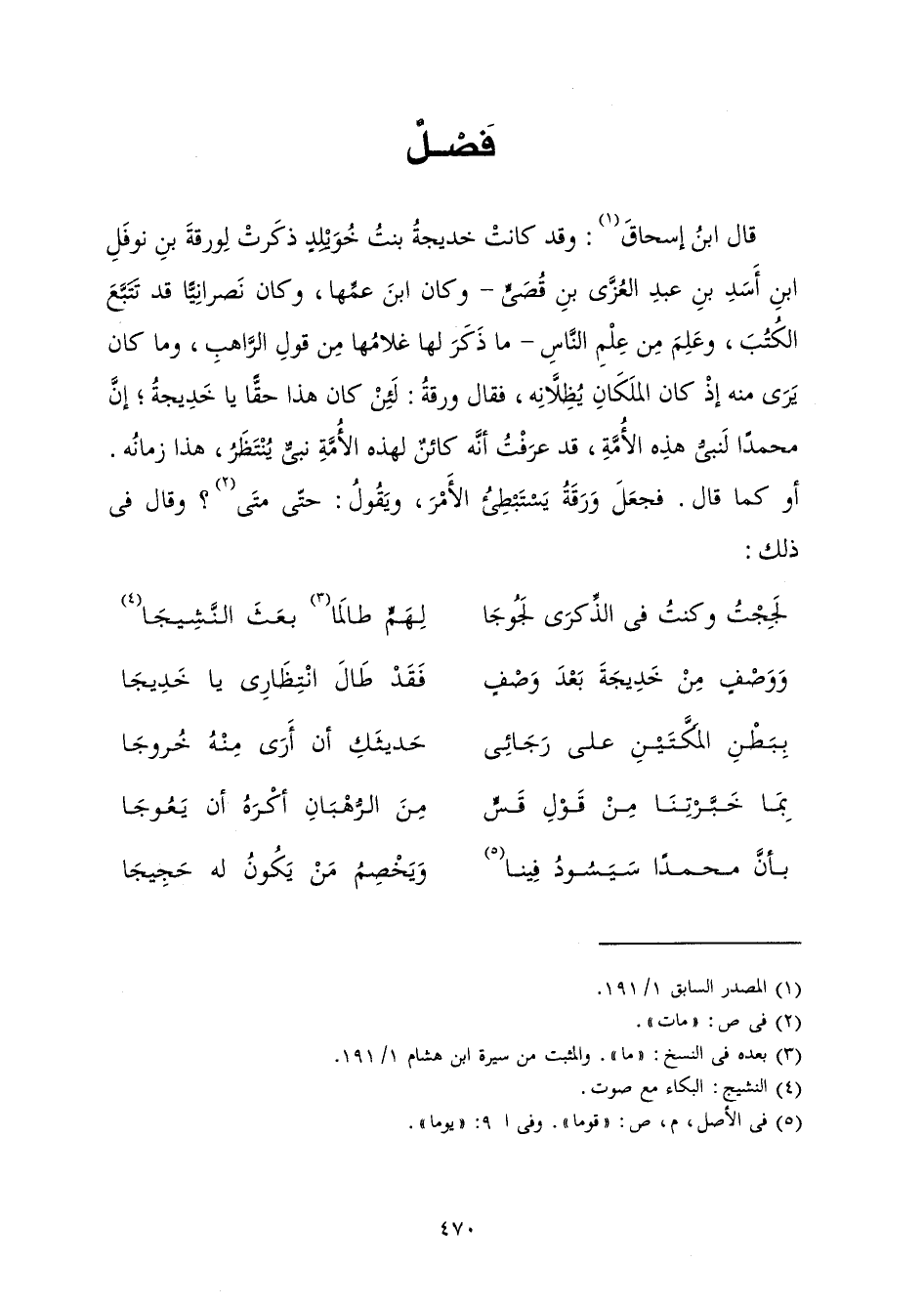 قَالَ ابْنُ إِسْحَاقَ وَقَدْ كَانَتْ خَدِيجَةُ بِنْتُ خُوَيْلِدٍ ذَكَرَتْ لِوَرَقَةَ بْنِ نَوْفَلِ بْنِ أَسَدِ بْنِ عَبْدِ الْعُزَّىِ بْنِ قُصَىٍّ - وَكَانَ ابْنَ عَمِّهَا وَكَانَ نَصْرَانِيًّا قَدْ تَتَبَّعَ الْكُتُبَ، وَعَلِمَ مِنْ عِلْمِ النَّاسِ - مَا ذَكَرَ لَهَا غُلَامُهَا مِنْ قَوْلِ الرَّاهِبِ وَمَا كَانَ يُرَى مِنْهُ إِذْ كَانَ الْمَلَكَانِ يُظِلَّانِهِ فَقَالَ وَرَقَةُ: لَئِنْ كَانَ هَذَا حَقًّا يَا خَدِيجَةُ إِنَّ مُحَمَّدًا لَنَبِيُّ هَذِهِ الْأُمَّةِ، قَدْ عَرَفْتُ أَنَّهُ كَائِنٌ لِهَذِهِ الْأُمَّةِ نَبِيٌّ يُنْتَظَرُ هَذَا زَمَانُهُ أَوْ كَمَا قَالَ فَجَعَلَ وَرَقَةُ يَسْتَبْطِئُ الْأَمْرَ وَيَقُولُ حَتَّى مَتَى؟ وَقَالَ فِي ذَلِكَ: