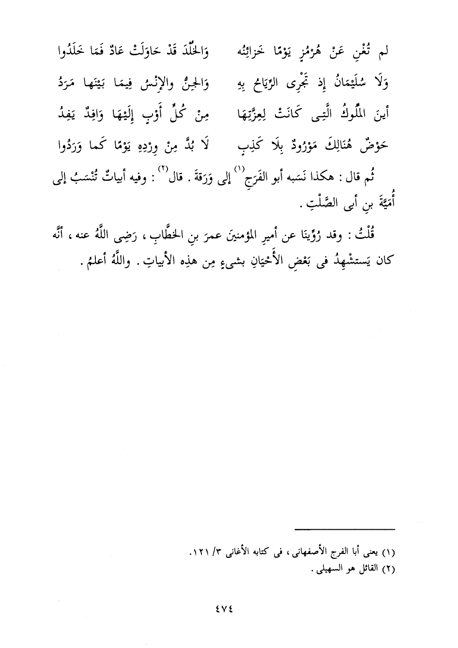 ثُمَّ قَالَ: هَكَذَا نَسَبَهُ أَبُو الْفَرَجِ إِلَى وَرَقَةَ. قَالَ: وَفِيهِ أَبْيَاتٌ تُنْسَبُ إِلَى أُمَيَّةَ بْنِ أَبِي الصَّلْتِ